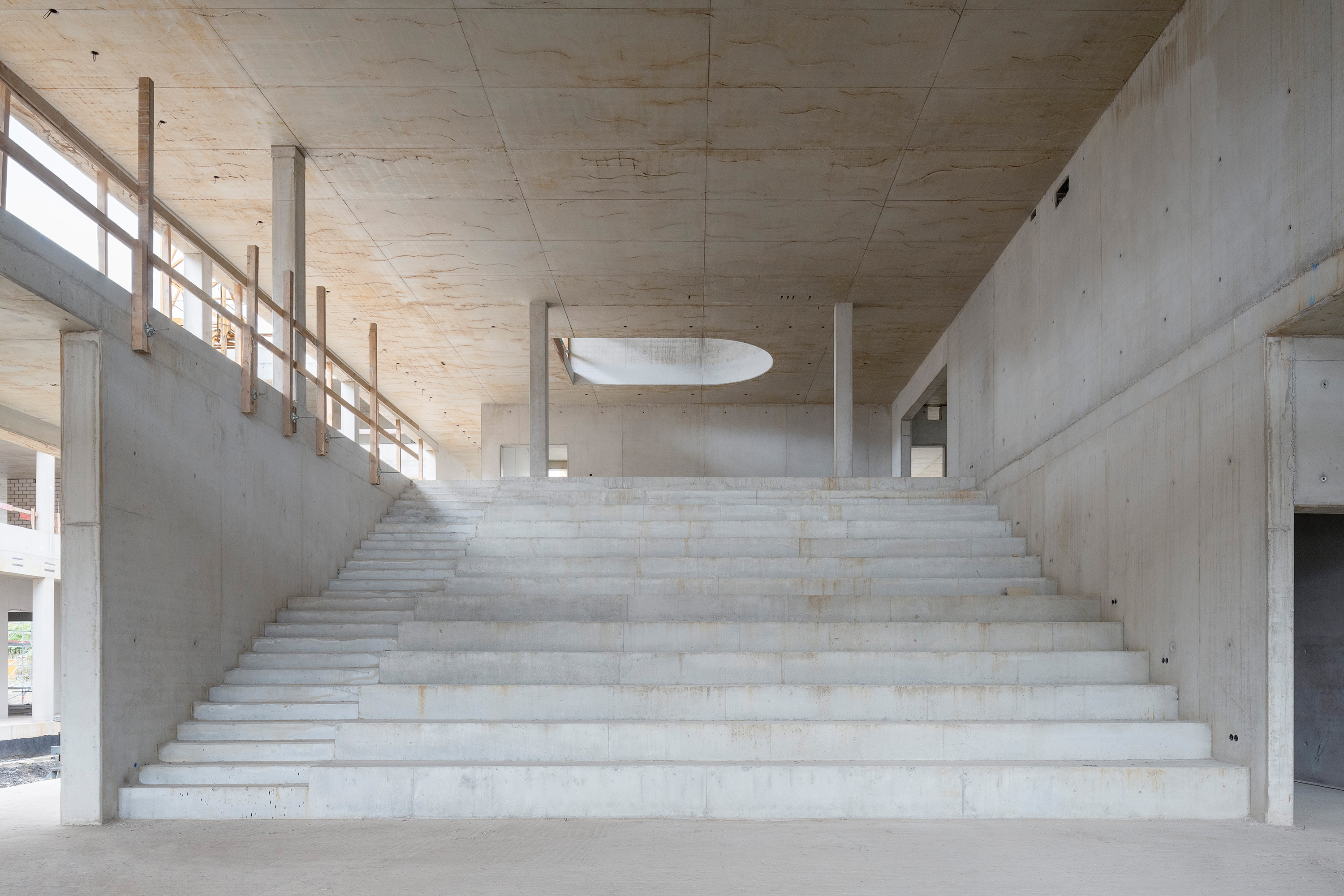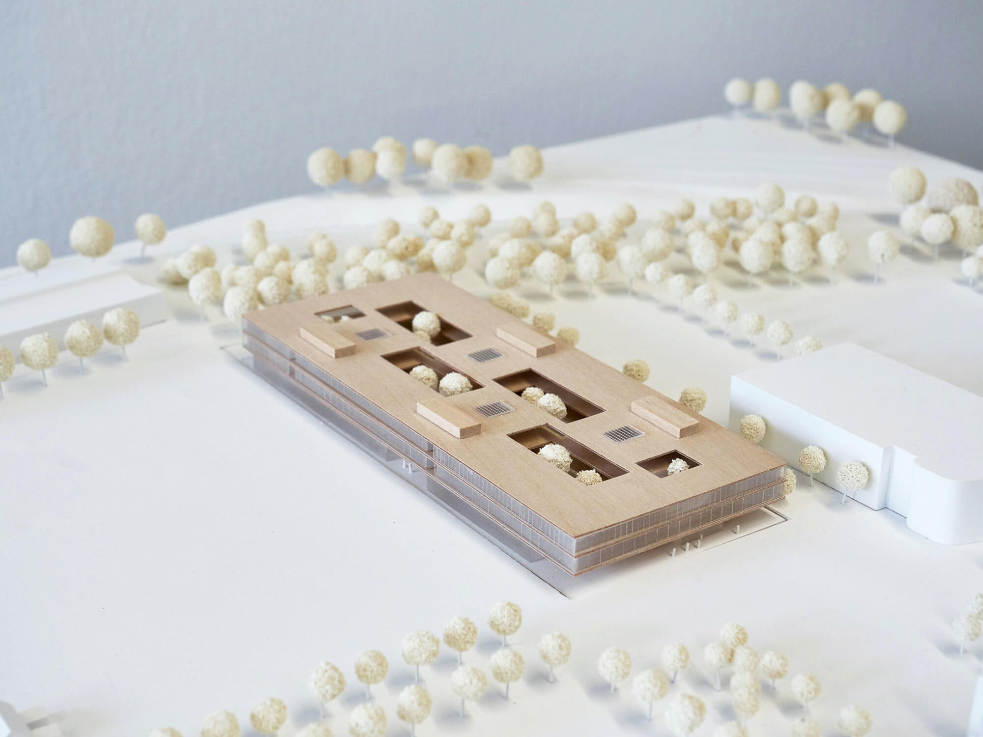 Vier große intensiv und dicht begrünte Innenhöfe gliedern das Lehr- und Forschungsforum. Sie schaffen eine grüne Mitte, die alle kommunikativen Funktionen aufnimmt. Das Erdgeschoss öffnet sich zum zentralen Campusplatz mit einem großzügigen Foyer, der Bibliothek und dem Café für die Studierenden. Es ist analog dem Prinzip einer Markthalle in einem informellen Raster von Wegen und Funktionen organisiert. Im Zentrum liegen die Plenarbereiche und der Hörsaal an den Innenhöfen. In den beiden Obergeschossen werden die Büroräume der Institute und Forschungseinheiten ringförmig um diese grüne Mitte angeordnet. Ein zentraler Weg entlang der grünen Innenhöfe bildet das kommunikative Rückgrat und vernetzt die verschiedenen Bereiche.