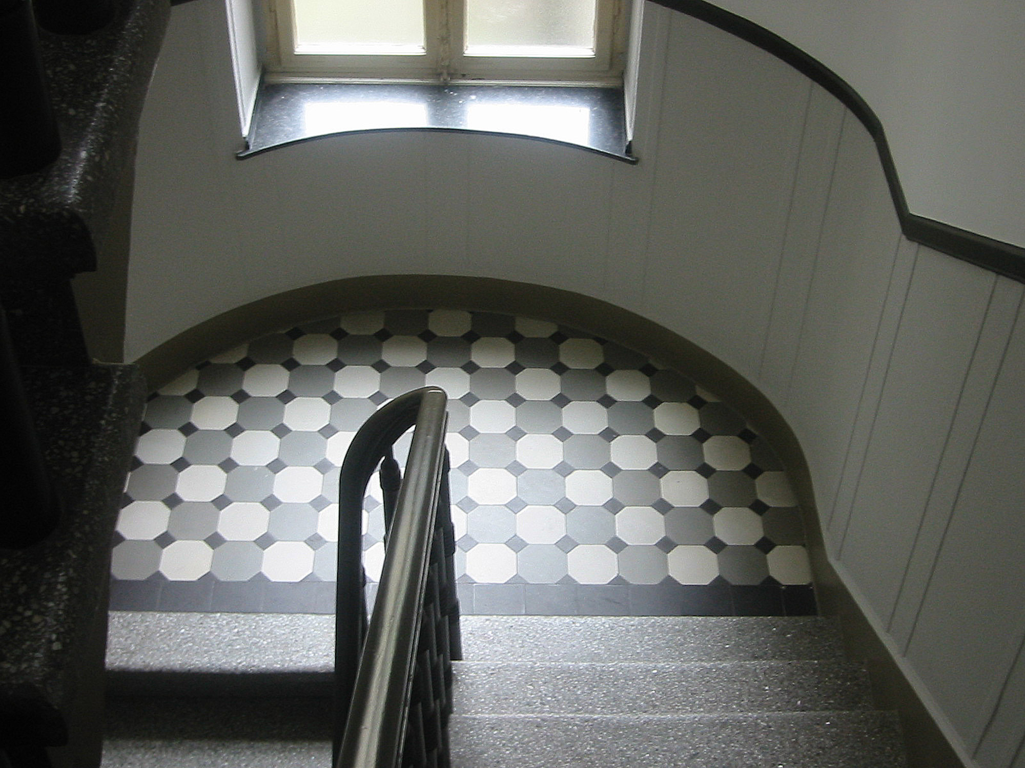 Elemente aus der Gründerzeit wurden im Treppenhaus sorgfältig aufgearbeitet und nach einem aus dem vorhandenen Fliesenmosaik abgeleiteten Farbkonzept gestaltet.
