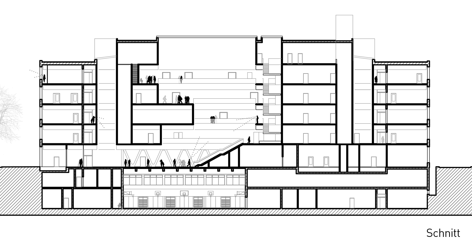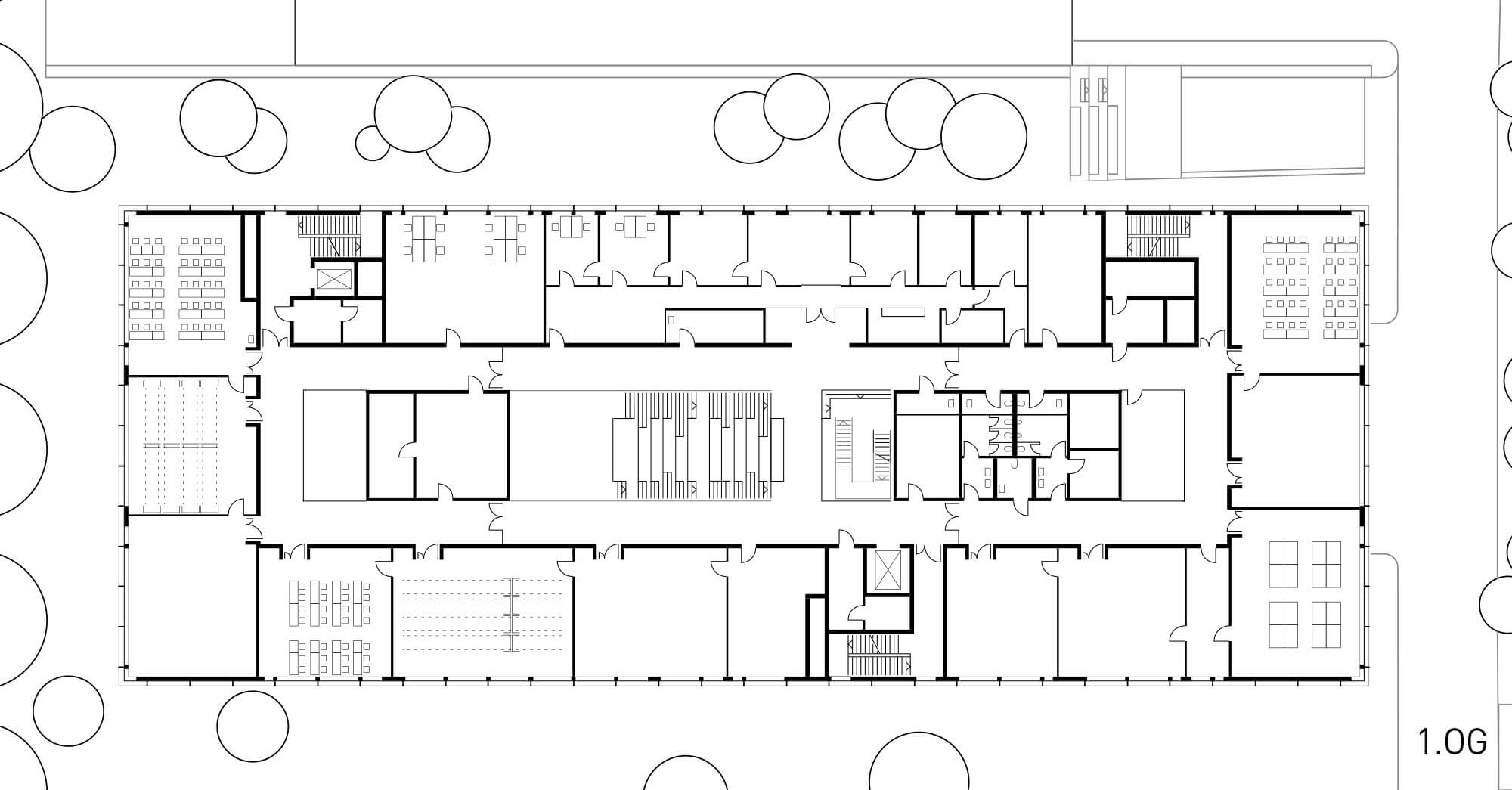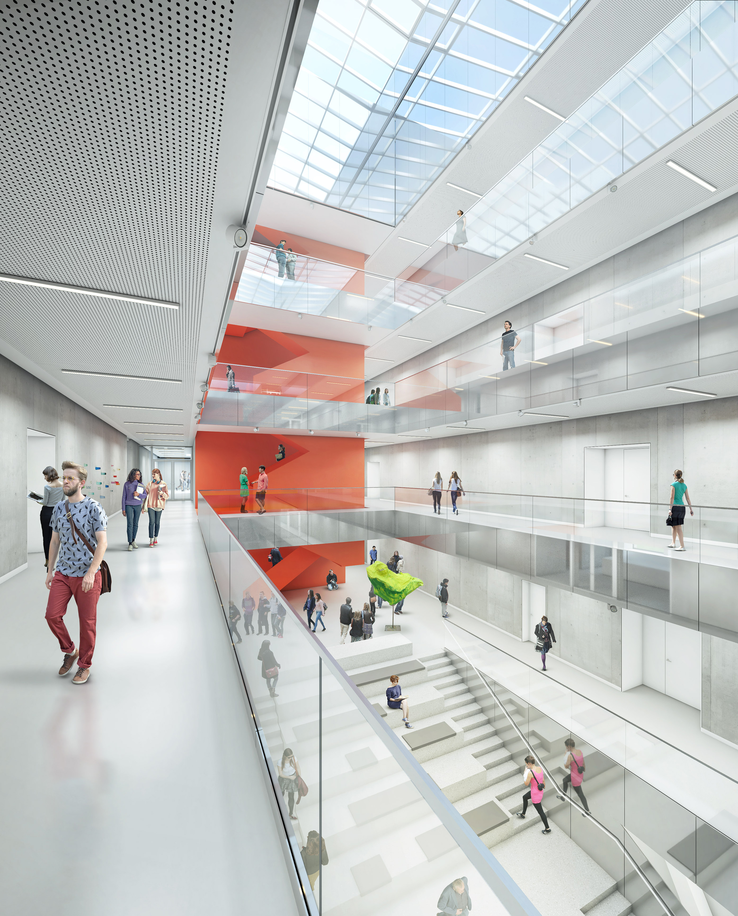 Die Unterrichtsräume und Werkstätten sind in den vier Obergeschossen im 'Äußeren Ring' entlang der Fassade untergebracht. Im Erdgeschoss befinden sich repräsentative und gemeinschaftliche Nutzungen wie die Pausen- und Ausstellungshalle, die Mensa und im rückwärtigen Bereich die Lackierhalle. Die Sporthalle erstreckt sich über die beiden Untergeschosse des Neubaus und kann über einen separaten Zugang auch von Vereinssportlern genutzt werden. Über Lichthöfe im Bereich der Mittelzone sind Blickbezüge über alle Ebenen möglich und es gelangt zusätzliches Tageslicht in die Pausen- und Ausstellungshalle.