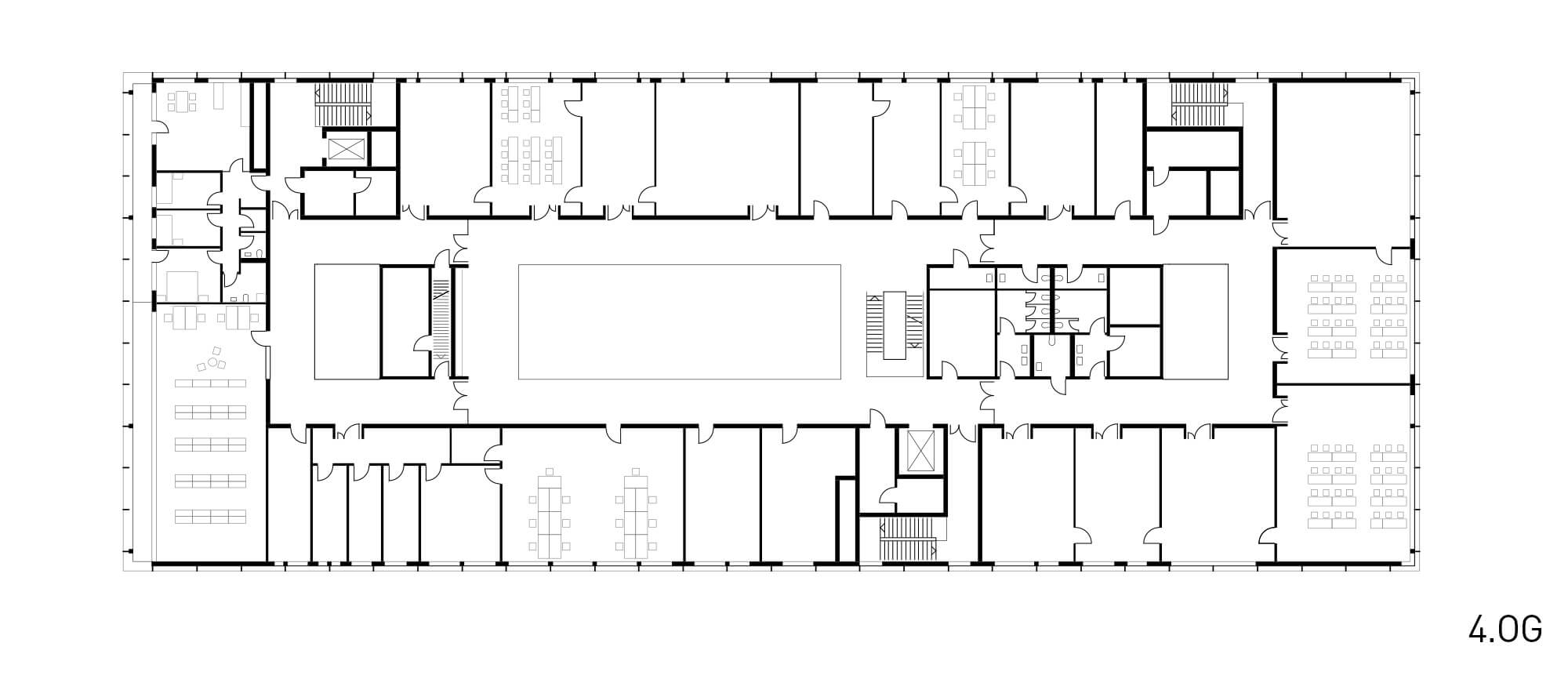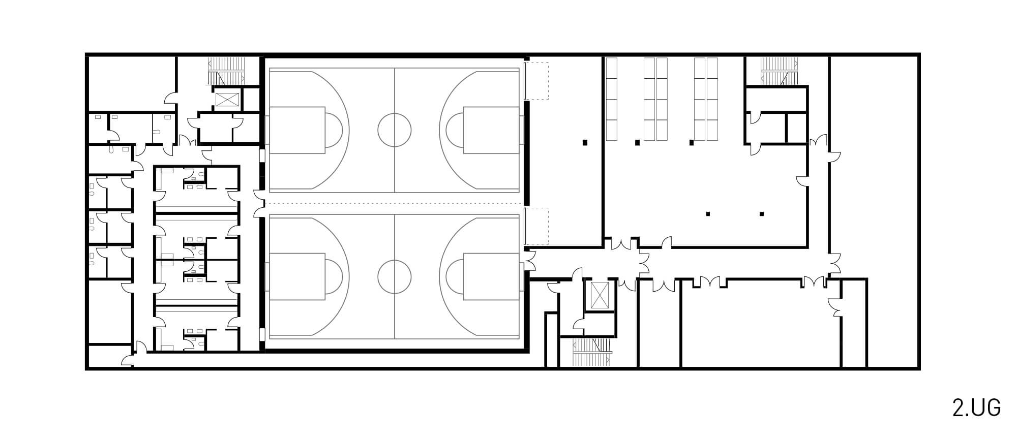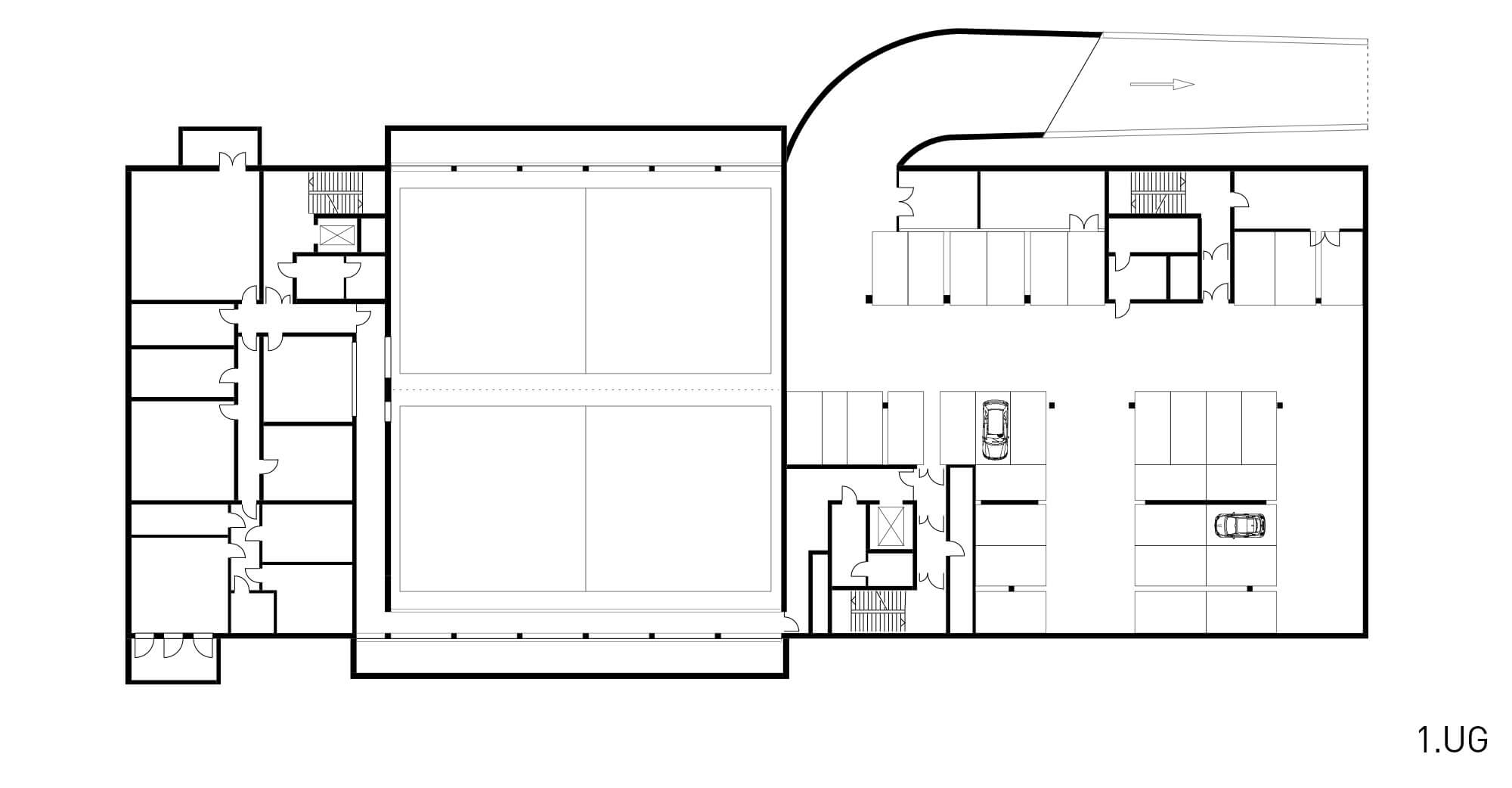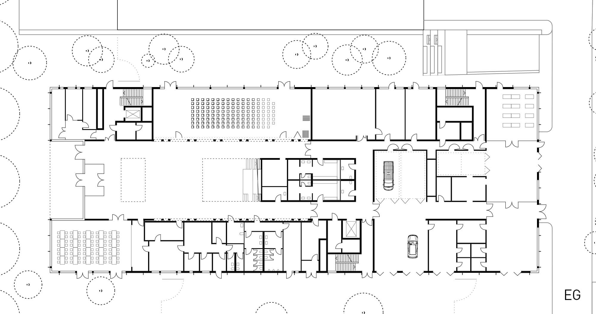 Die Unterrichtsräume und Werkstätten sind in den vier Obergeschossen im 'Äußeren Ring' entlang der Fassade untergebracht. Im Erdgeschoss befinden sich repräsentative und gemeinschaftliche Nutzungen wie die Pausen- und Ausstellungshalle, die Mensa und im rückwärtigen Bereich die Lackierhalle. Die Sporthalle erstreckt sich über die beiden Untergeschosse des Neubaus und kann über einen separaten Zugang auch von Vereinssportlern genutzt werden. Über Lichthöfe im Bereich der Mittelzone sind Blickbezüge über alle Ebenen möglich und es gelangt zusätzliches Tageslicht in die Pausen- und Ausstellungshalle.