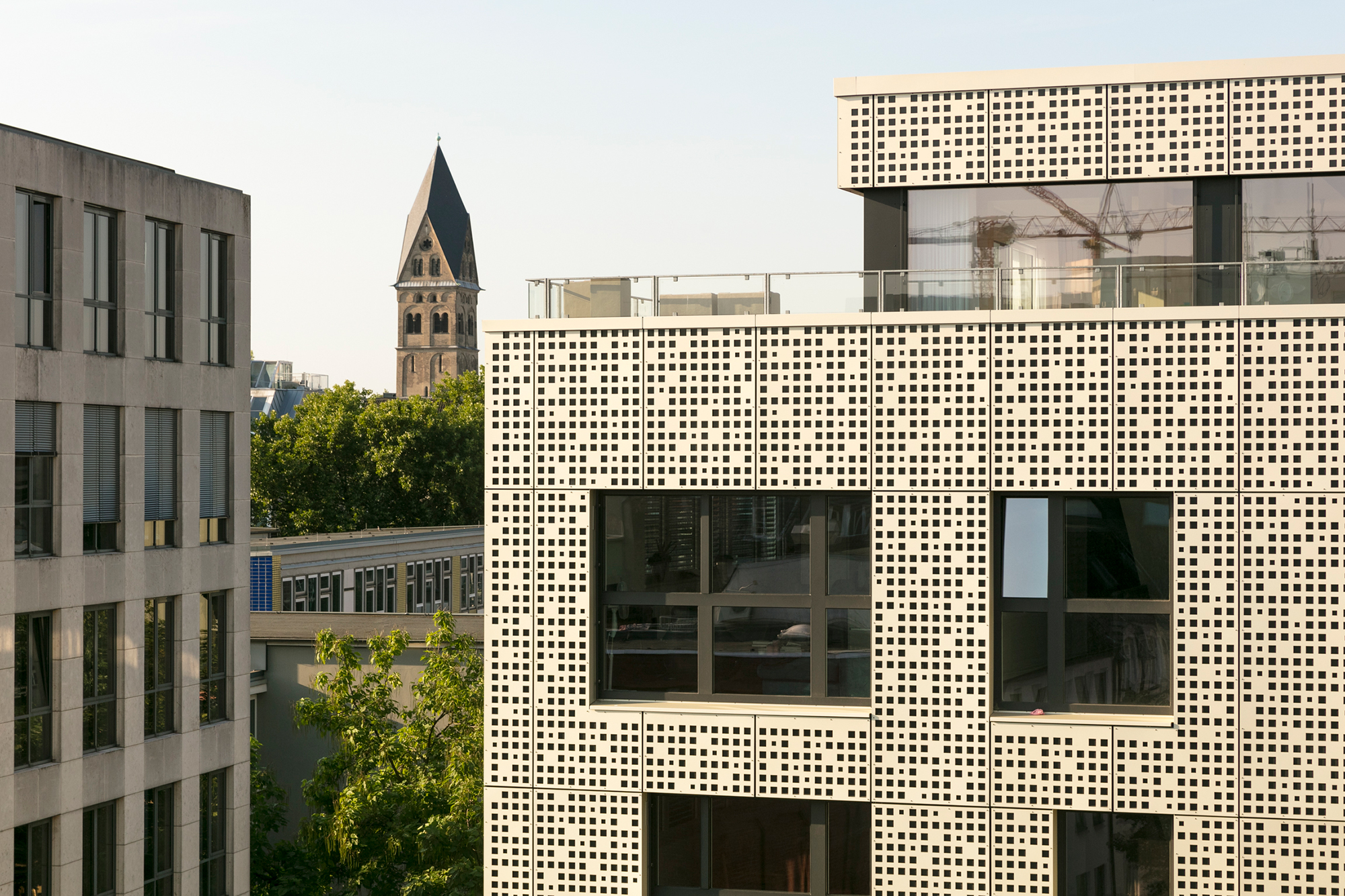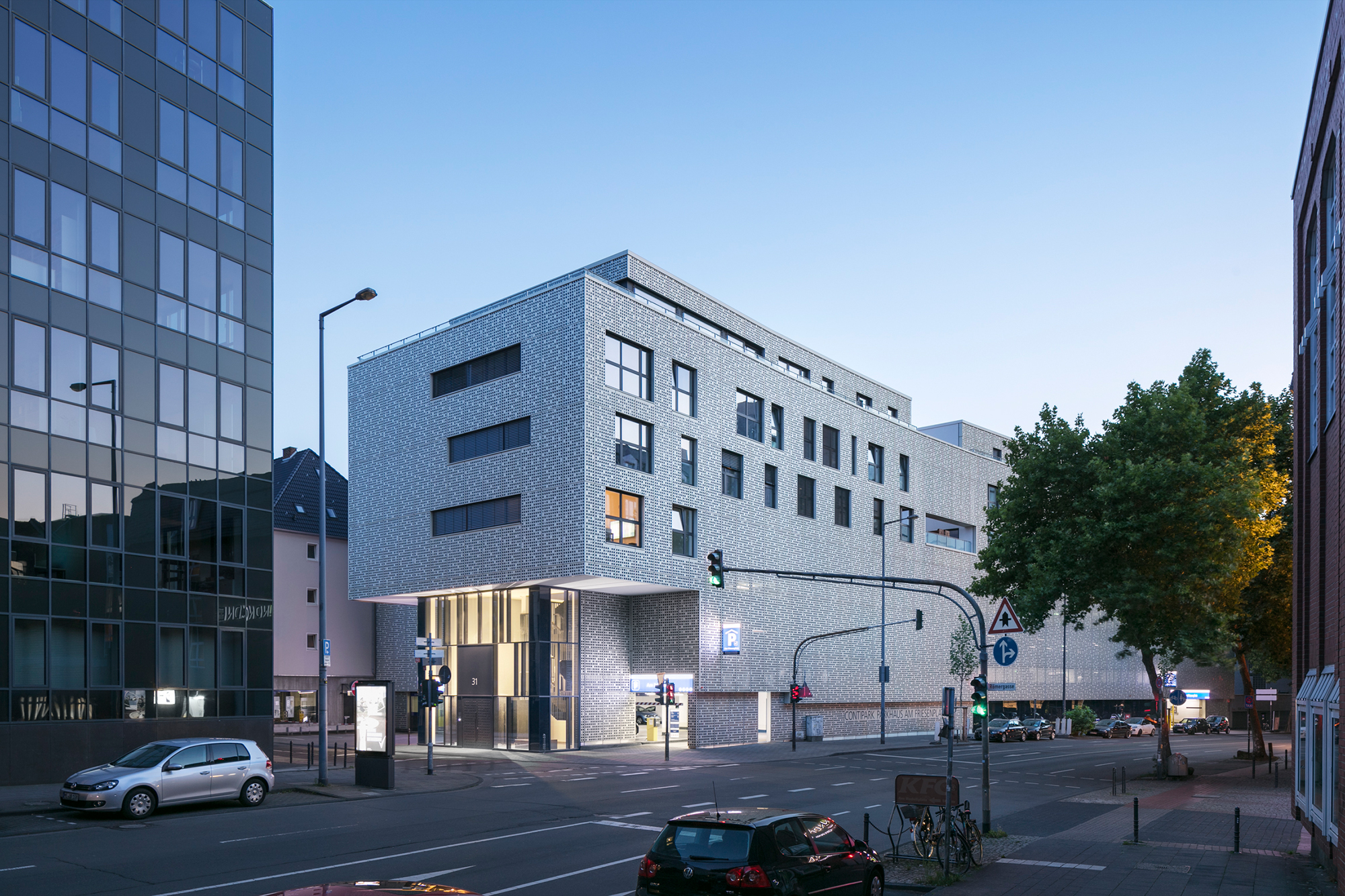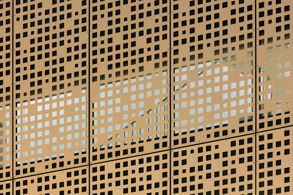 Eine einheitliche, perforierte, metallische Haut vernäht fugenlos das Parkhaus und die Wohnebenen zu einer städtebaulichen Einheit und löst in subtiler Form die vielfältigen Anforderungen. Die perforierte Haut reagiert mit unterschiedlichen Maschenweiten auf die horizontale Schichtung des komplexen Gebäudeprogramms. Die bisher von der Autonutzung geprägte innerstädtische Situation der Magnusstraße wird durch die schillernde Fassade zurückhaltend und doch signifikant aufgewertet.