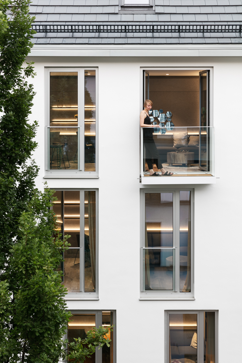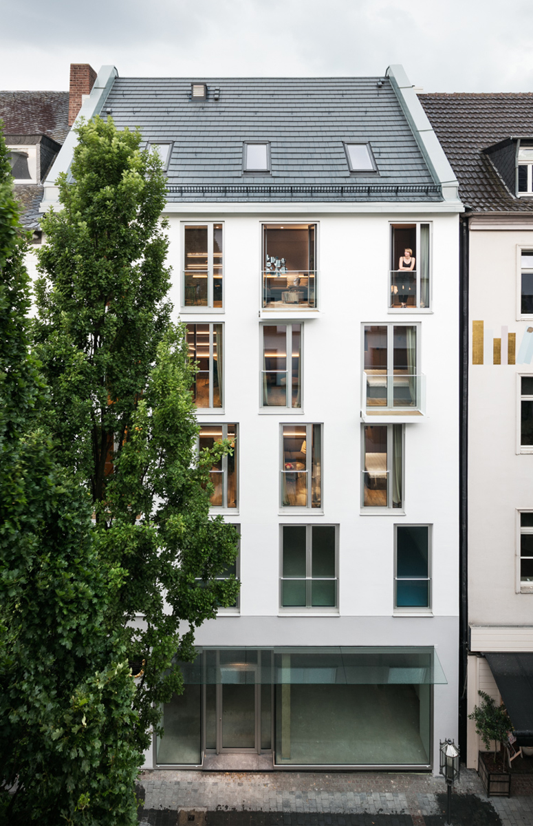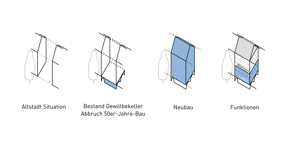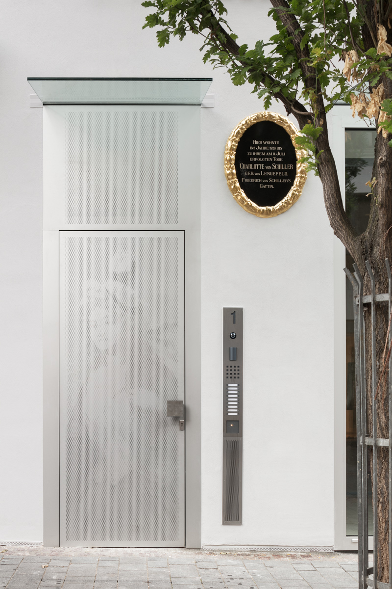 Ein vorhandenes Wohn- und Geschäftshaus in der Bonner Innenstadt wird aufgrund seiner desolaten Bausubstanz aus der Nachkriegszeit bis auf das Kellergewölbe abgebrochen und zeitgemäß verdichtet wieder aufgebaut. Neben dem großzügigen Ladenlokal im Erd- und 1. Obergeschoss entstehen moderne und spannend zonierte Appartments in den Obergeschossen. Die Appartments werden sorgfältig möbliert und zur temporären Vermietung vorgesehen. Die gelaserte Eingangstür verweist auf Charlotte von Schiller, die bis zu Ihrem Tode an diesem Ort lebte.