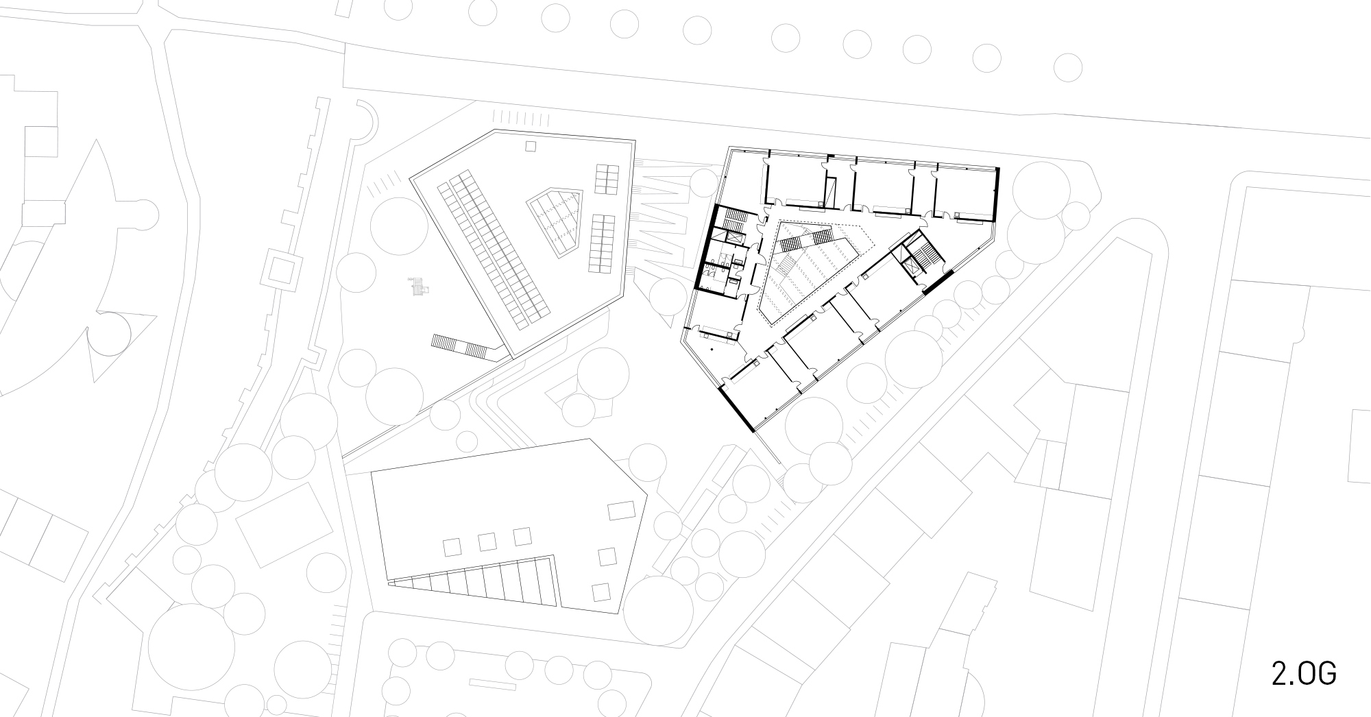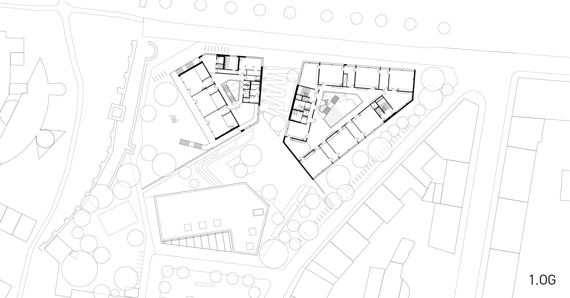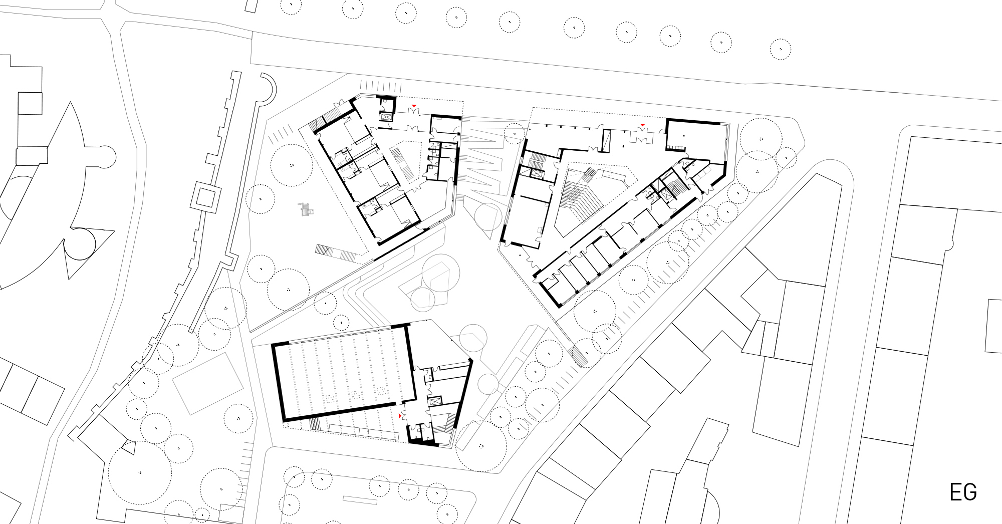 Das Konzept greift die Idee einer Schule im Park auf. Schule, Kita und Sporthalle werden als drei Bausteine im Grünen angeordnet. Unter Berücksichtigung von Wege- und Blickbeziehungen untereinander und zur umgebenden Bebauung werden die Baukörper geformt. Dabei wird insbesondere die Stadtmauer mit Hinkelsturm als historischer Zeuge und musealem Bildungselement in das Konzept des Bildungsstandortes mit einbezogen.