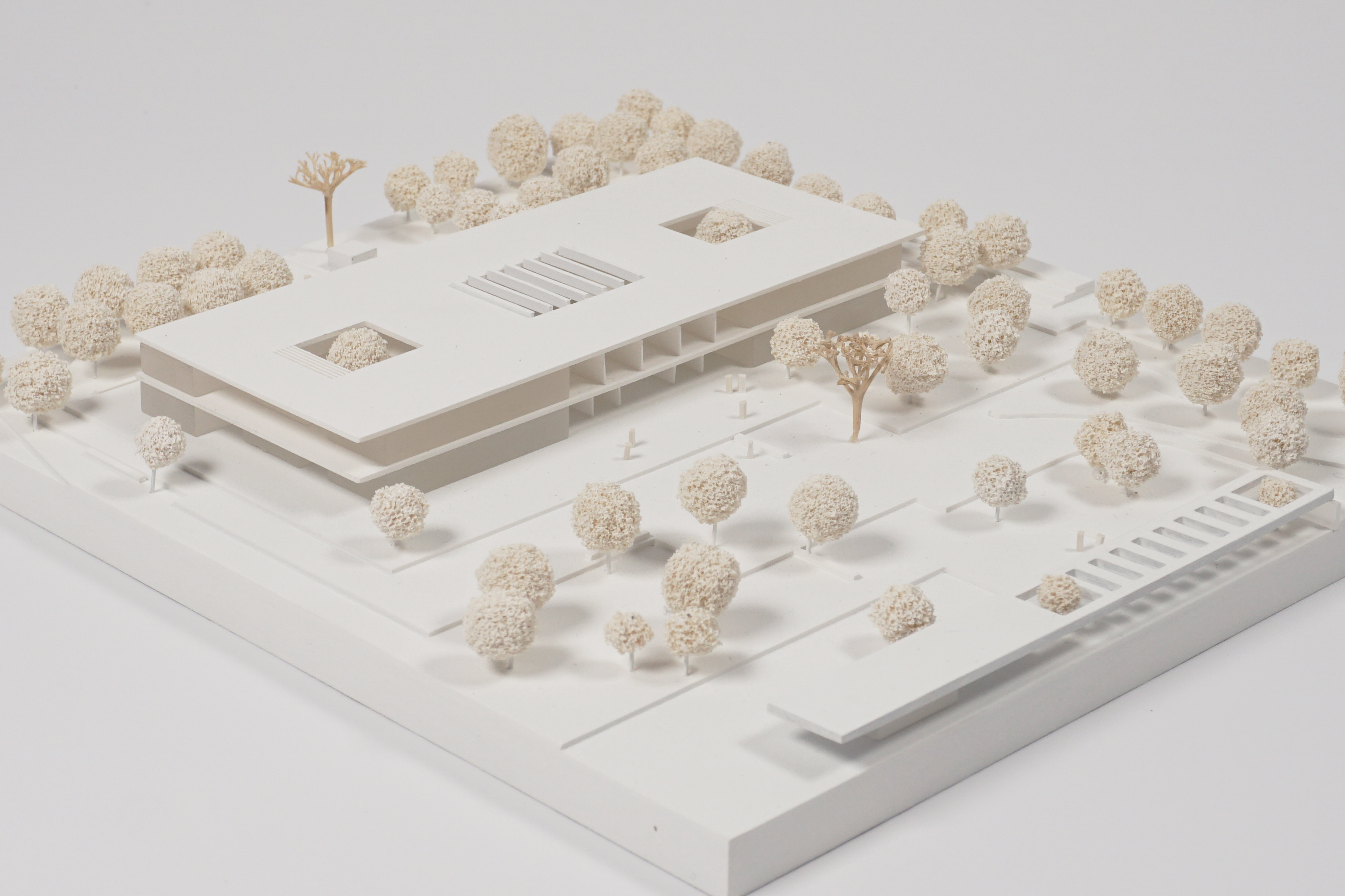 Eine einfache pavillonartige Holzstruktur setzt sich als selbstverständliche Kubatur in das vorhandene grüne Schulgrundstück. Durch die kompakte Anordnung entstehen großzügige gut proportionierte Freiräume, die den parkartigen Bestand fortschreiben.