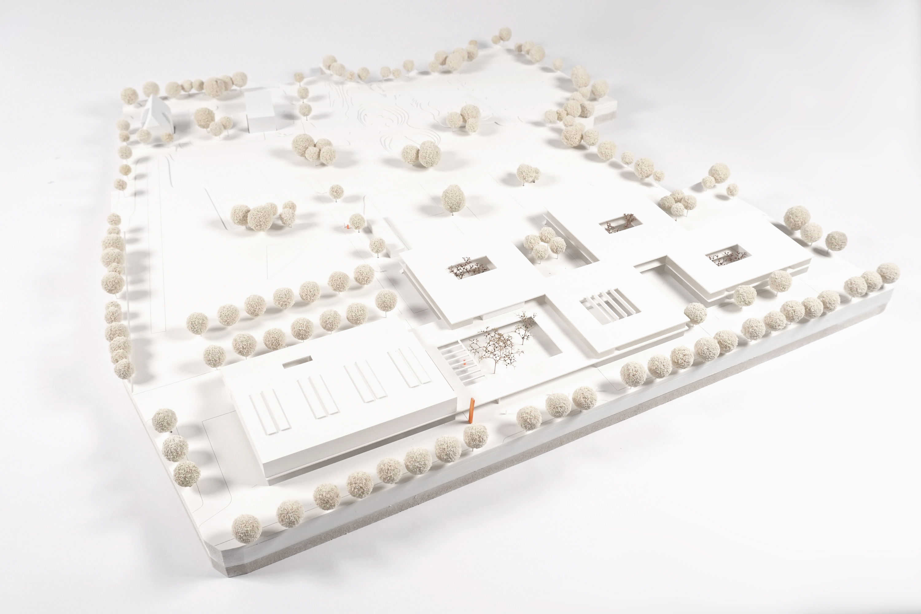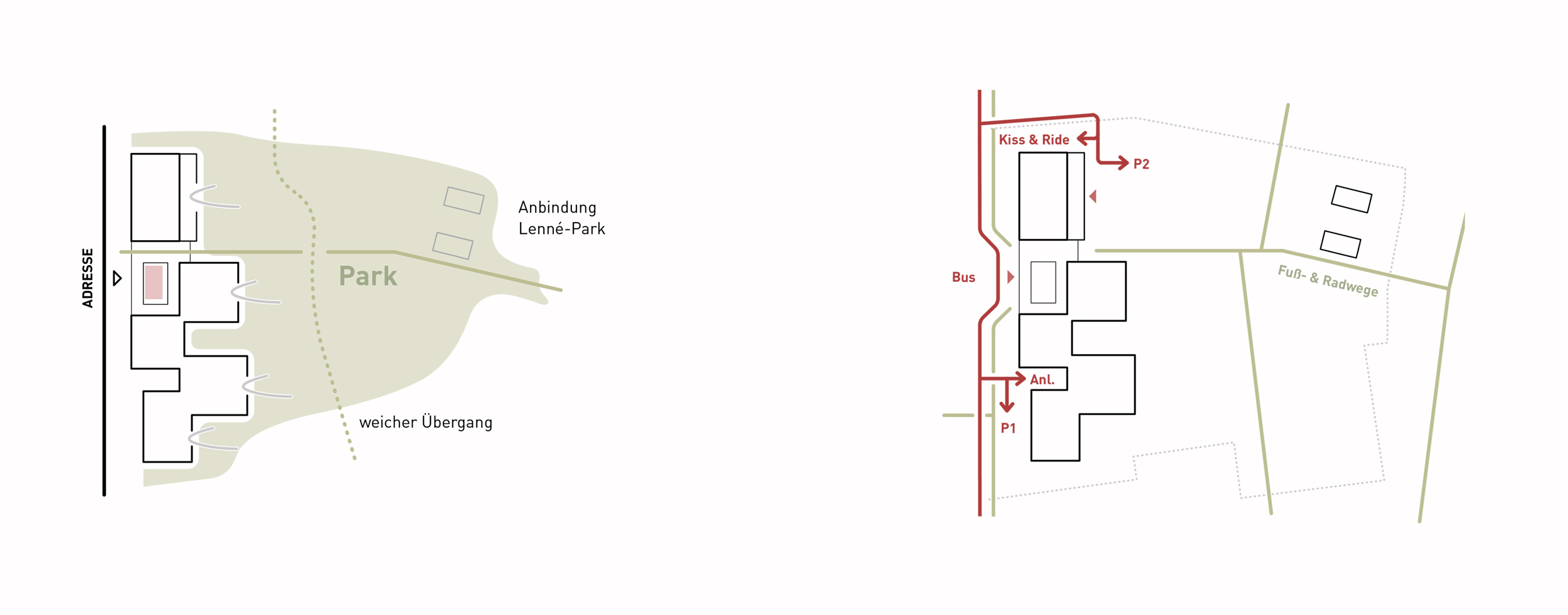 Unser Entwurf positioniert die neuen Gebäude als mäandrierender Filter zwischen Straße und Park. Schulgebäude und Sporthallen sind im Westen des Areals entlang der Straße angeordnet. Schützend und doch offen bilden sie im Wechsel mit den funktional für die Erschließung genutzten Zwischenräumen eine klar erkennbare Identität und schirmen den Schulhof sowie den neu geplanten Sport-und Spielpark von der Straße ab. Nach Südosten hin öffnen sich die geplanten Gebäude und Höfe und bieten attraktive Blickbeziehungen in den mit Baumgruppen gestalteten Landschaftspark.
