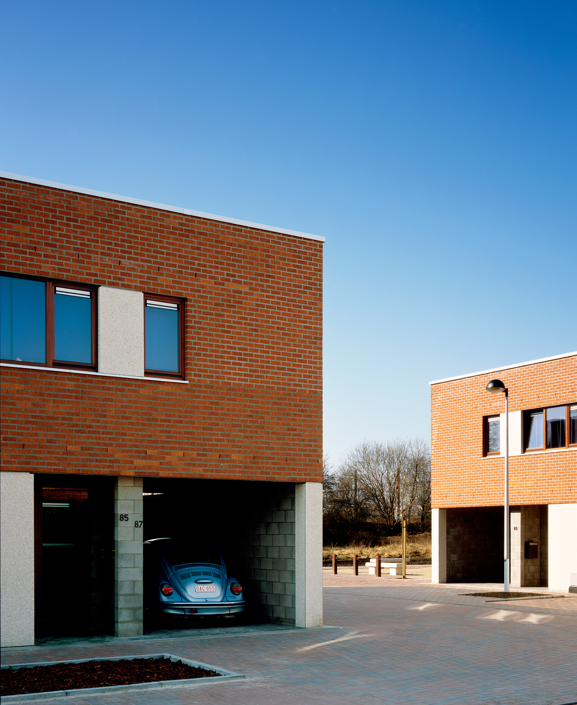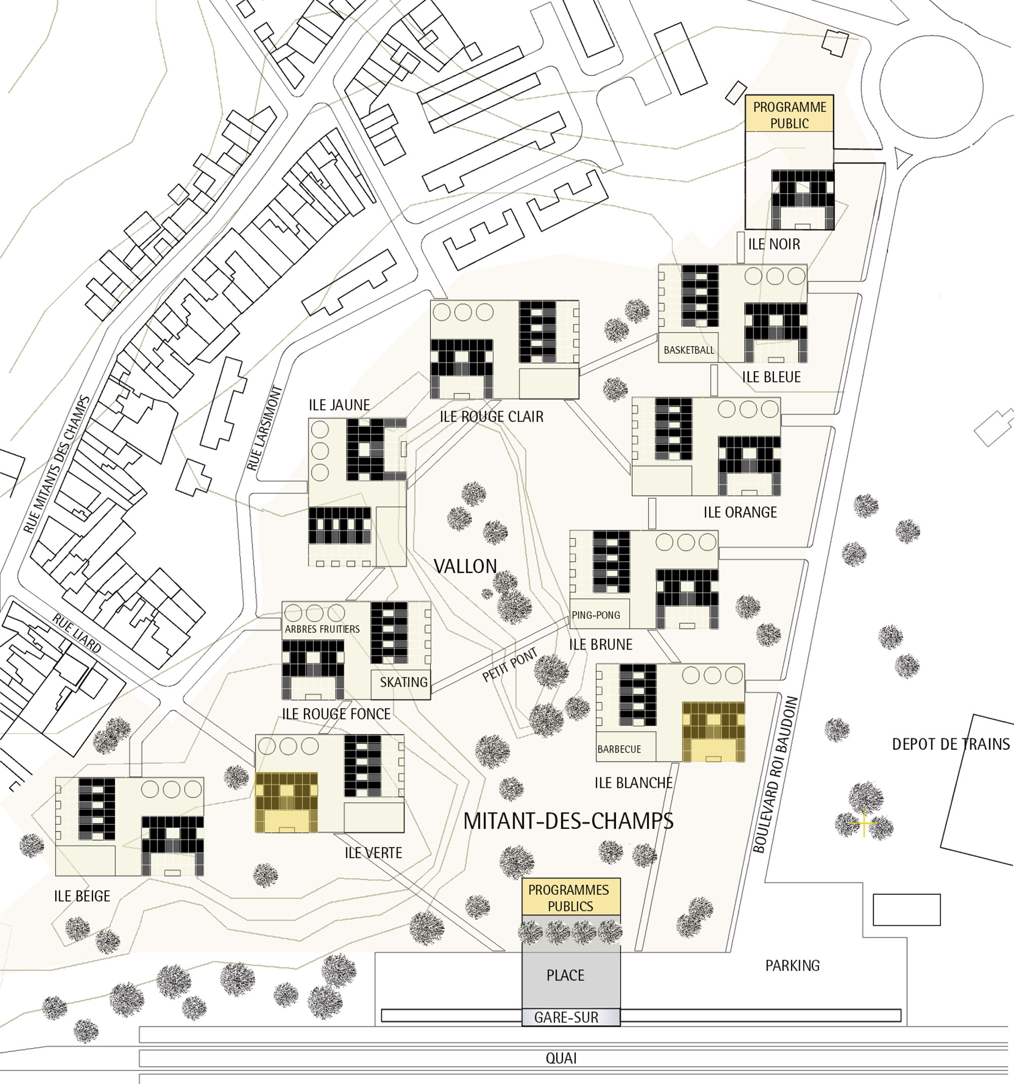 Die Neubaumaßnahmen von 100 Wohneinheiten und öffentliche Funktionen vor dem Bahnhof werden auf sogenannten 'Wohninseln' vorgesehen. Die Dimension der 'Insel' ist von den umgebenen Gebäuden abgeleitet und vermittelt zwischen den Reihenhäusern und den Straßenbahndepots. Die Positionierung der gebauten Strukturen auf einer Insel lässt zwei halböffentliche Plätze entstehen. Der 'harte' Platz vermittelt zwischen den Häusern und ihrer Anbindung an das vorhandene Straßennetz. Der 'weiche' Platz liegt zwischen den Häusern und dem vorhandenen Grün und dient Erholungszwecken. Die Wohnungen setzen die vorgefundene, traditionelle Typologie der zweigeschossigen Reihenhäuser fort und adaptieren sie an die Bedürfnisse der heutigen Gesellschaft: Der Gedanke des Gartens als Mittel des Selbstverständnisses und Verwirklichung wird fortgeführt und in seiner räumlichen Ausbildung neu interpretiert. Der typische Vorgarten der Reihenhaussiedlung wird zum Eingangshof / Patio, der das Haus mit dem Vorplatz der Wohninsel verzahnt. Der ehemalige Wirtschaftsgarten wird zum Garten, der das Haus mit der umgebenden Landschaft verbindet.