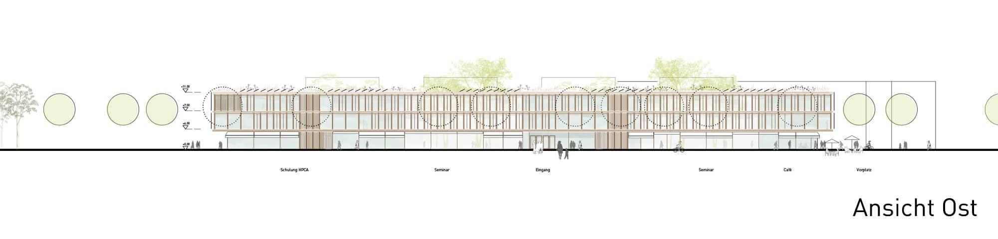 Arbeiten, Forschen und Lehren in einer offenen, kommunikativen und flexiblen Gebäudestruktur, die auf die naheliegenden botanischen Gärten Bezug nimmt: Am zentralen Campusplatz gelegen, orientiert sich das neue Lehr- und Forschungsforum mit seiner Breite und Höhe an der gegenüberliegenden landwirtschaftlichen Bibliothek und fügt sich mit drei Geschossen in die Umgebung ein. Der Haupteingang wird durch einen Rücksprung der Fassade mit überdachtem Freibereich akzentuiert. Als zentrales Forum am Campus erhält das Gebäude je einen Zugang an allen weiteren Seiten. Bodentiefe Verglasungen verzahnen die Innen- und Außenbereiche und bilden einen fließenden Übergang.