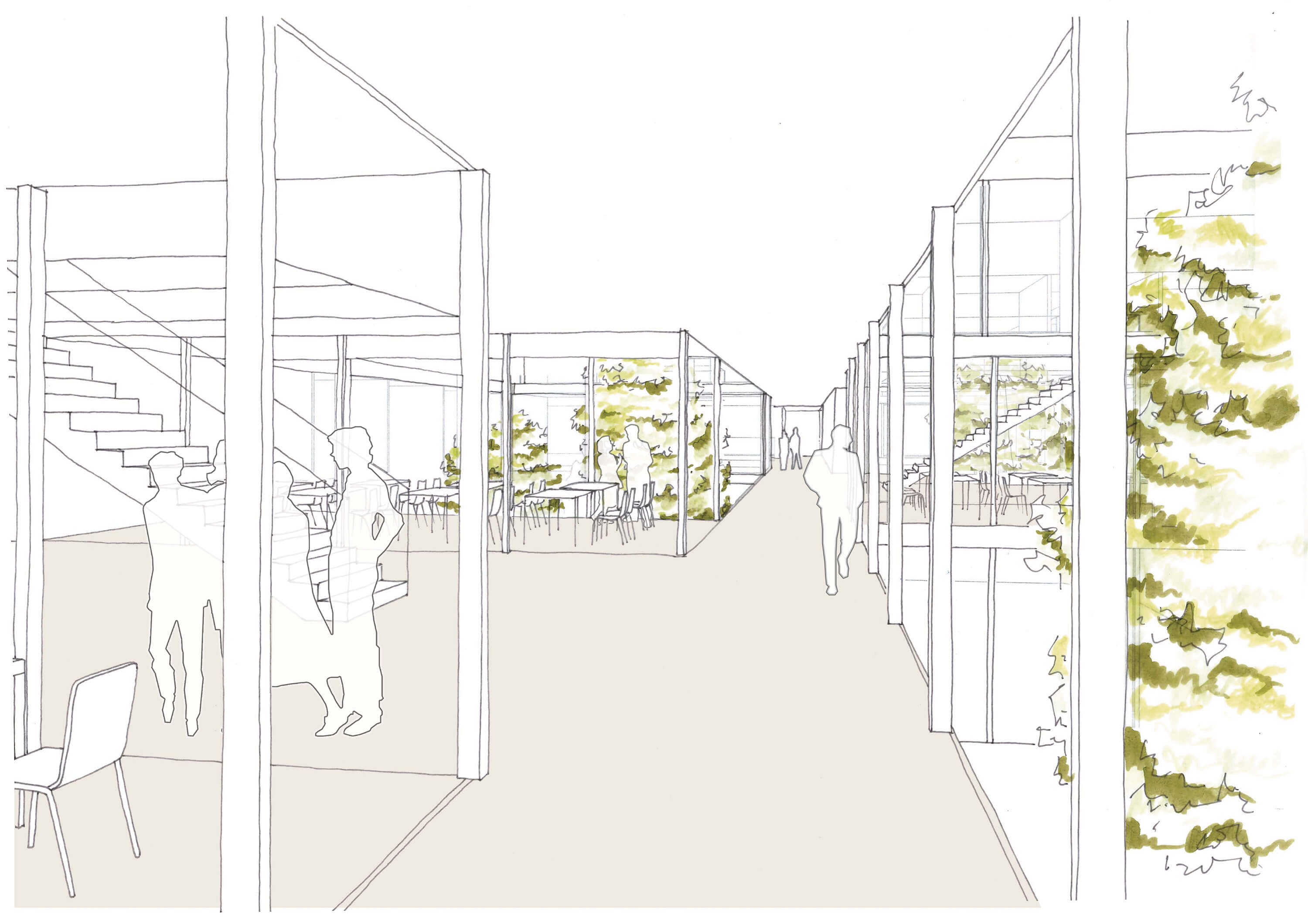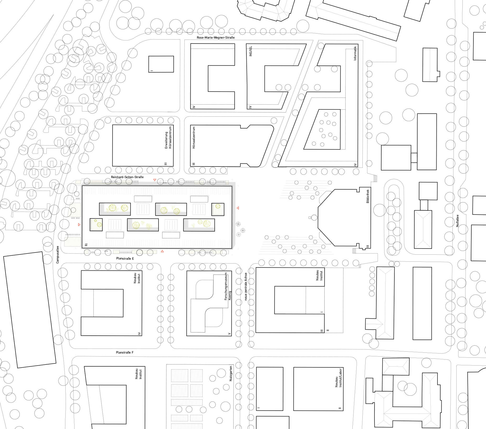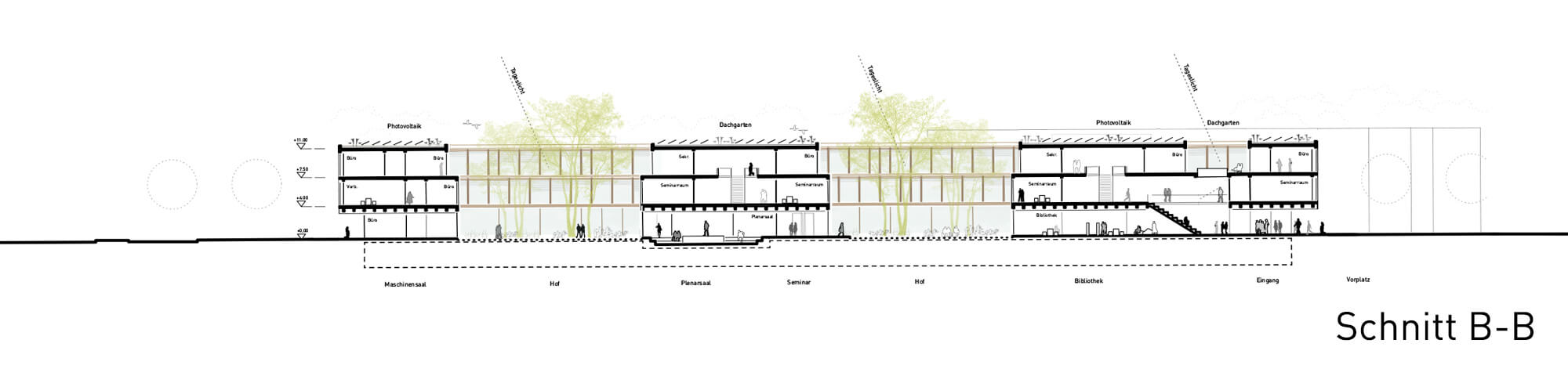 Vier große intensiv und dicht begrünte Innenhöfe gliedern das Lehr- und Forschungsforum. Sie schaffen eine grüne Mitte, die alle kommunikativen Funktionen aufnimmt. Das Erdgeschoss öffnet sich zum zentralen Campusplatz mit einem großzügigen Foyer, der Bibliothek und dem Café für die Studierenden. Es ist analog dem Prinzip einer Markthalle in einem informellen Raster von Wegen und Funktionen organisiert. Im Zentrum liegen die Plenarbereiche und der Hörsaal an den Innenhöfen. In den beiden Obergeschossen werden die Büroräume der Institute und Forschungseinheiten ringförmig um diese grüne Mitte angeordnet. Ein zentraler Weg entlang der grünen Innenhöfe bildet das kommunikative Rückgrat und vernetzt die verschiedenen Bereiche.