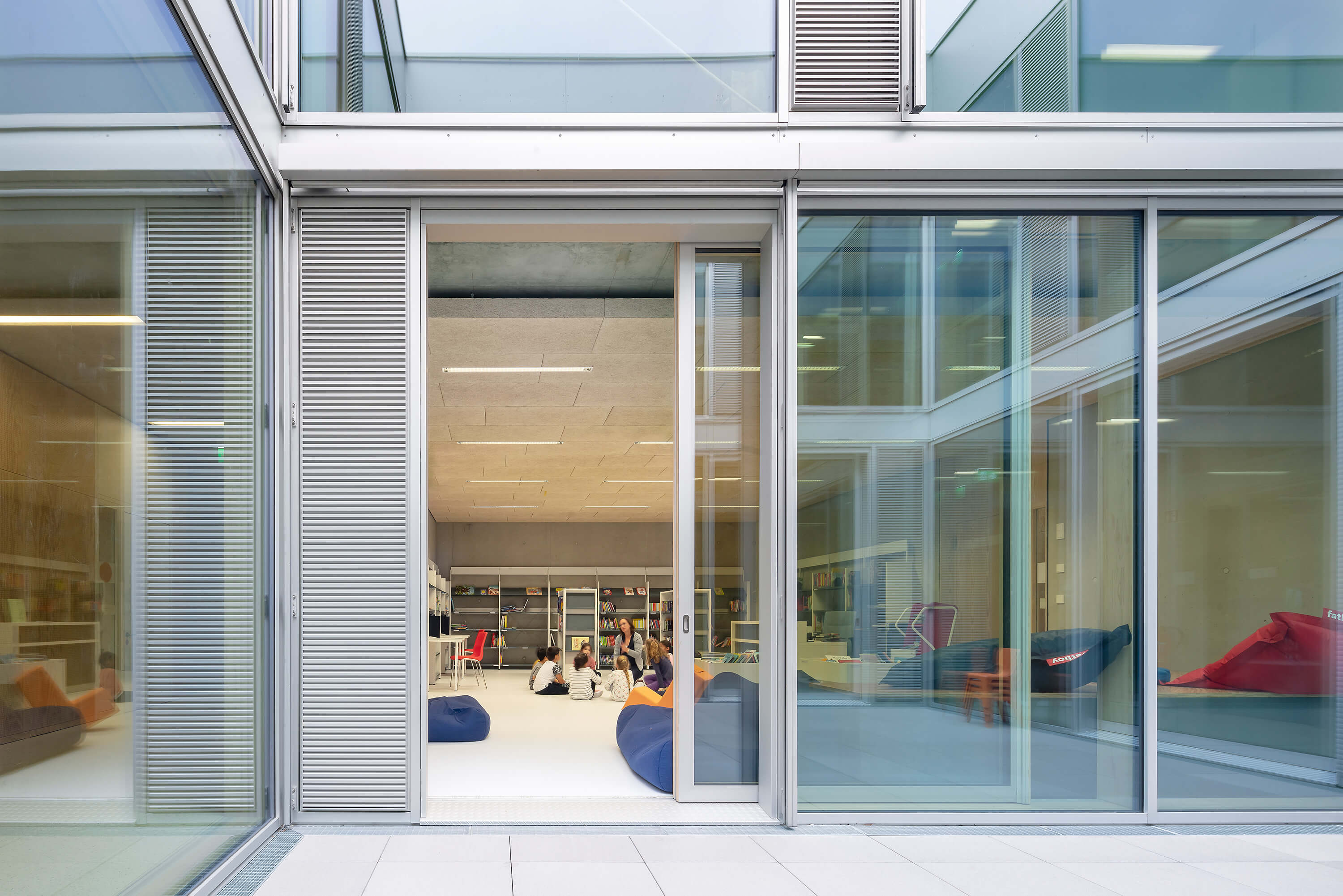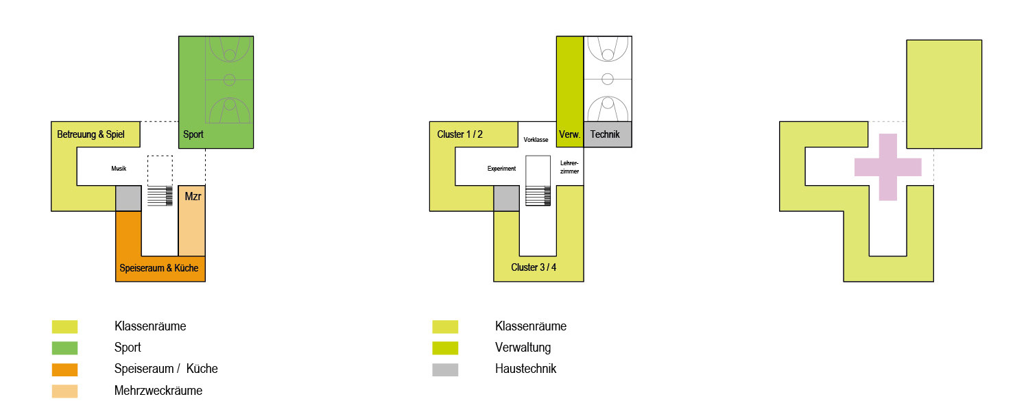 Sie wird über den Schulhof von Norden her erschlossen. Ein klar ablesbarer überdachter Zugangsbereich führt in das Herzstück der Schule, die zentrale zweigeschossige Pausenhalle. Sie verbindet mit einer Sitztreppe beide Geschosse und bietet eine einfache Orientierung innerhalb des Gebäudes. Um die Halle herum sind die drei Gebäudeflügel angeordnet, die die unterschiedlichen Funktionen der Schule aufnehmen.