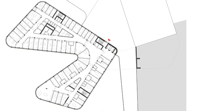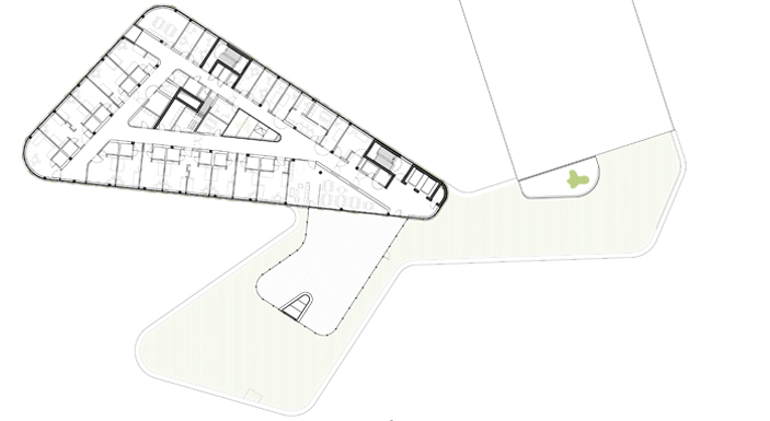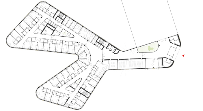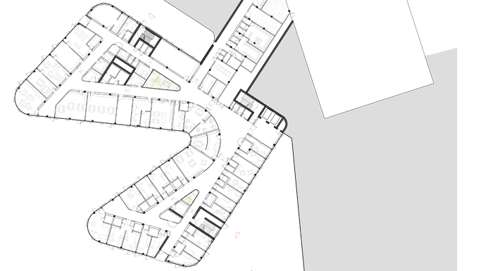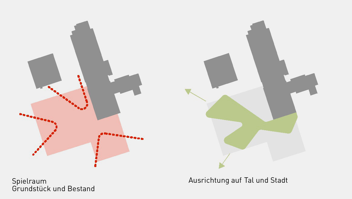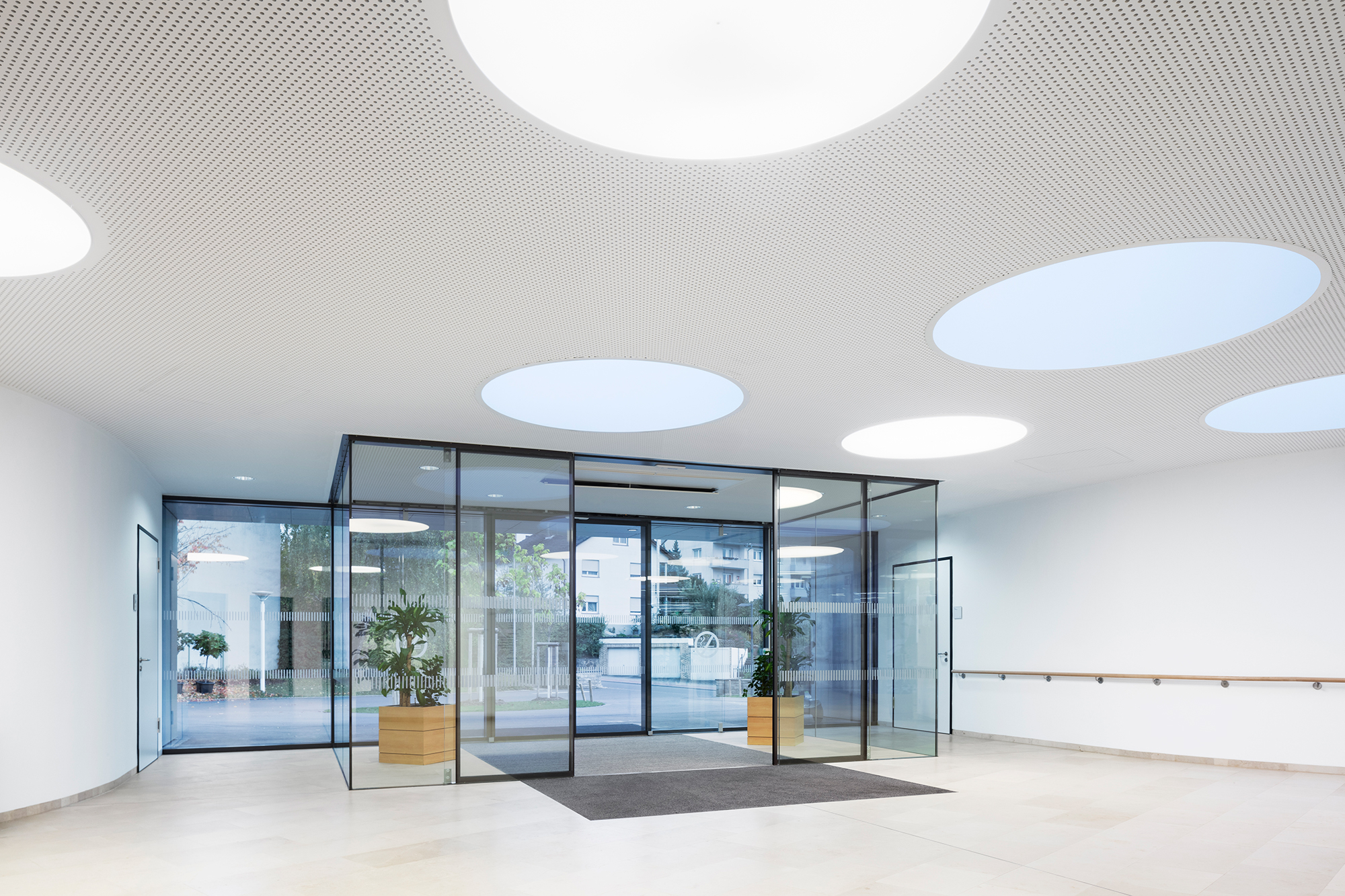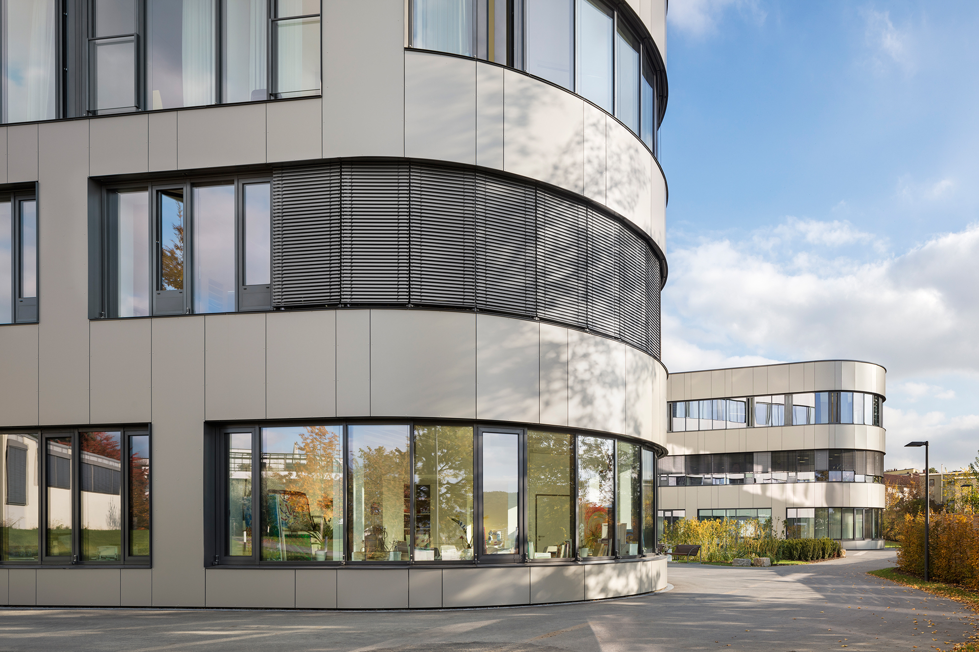 Der kleeblattartige Neubau setzt architektonisch ein neues Zeichen: Die Eingangssituation des Krankenhauses Tauberbischofsheim wird neu geprägt. Die geometrische Ausrichtung ergibt sich aus der Idee, den größten Teil der Räume auf den attraktiven Talblick auszurichten. Der weich geschwungene, kompakte Baukörper ermöglicht einen geringen Fußabdruck des Gebäudes mit relativ großen, parkähnlichen Freianlagen. Die Höhenstaffelung des Neubaus vermittelt zur umgebenden Bebauung.