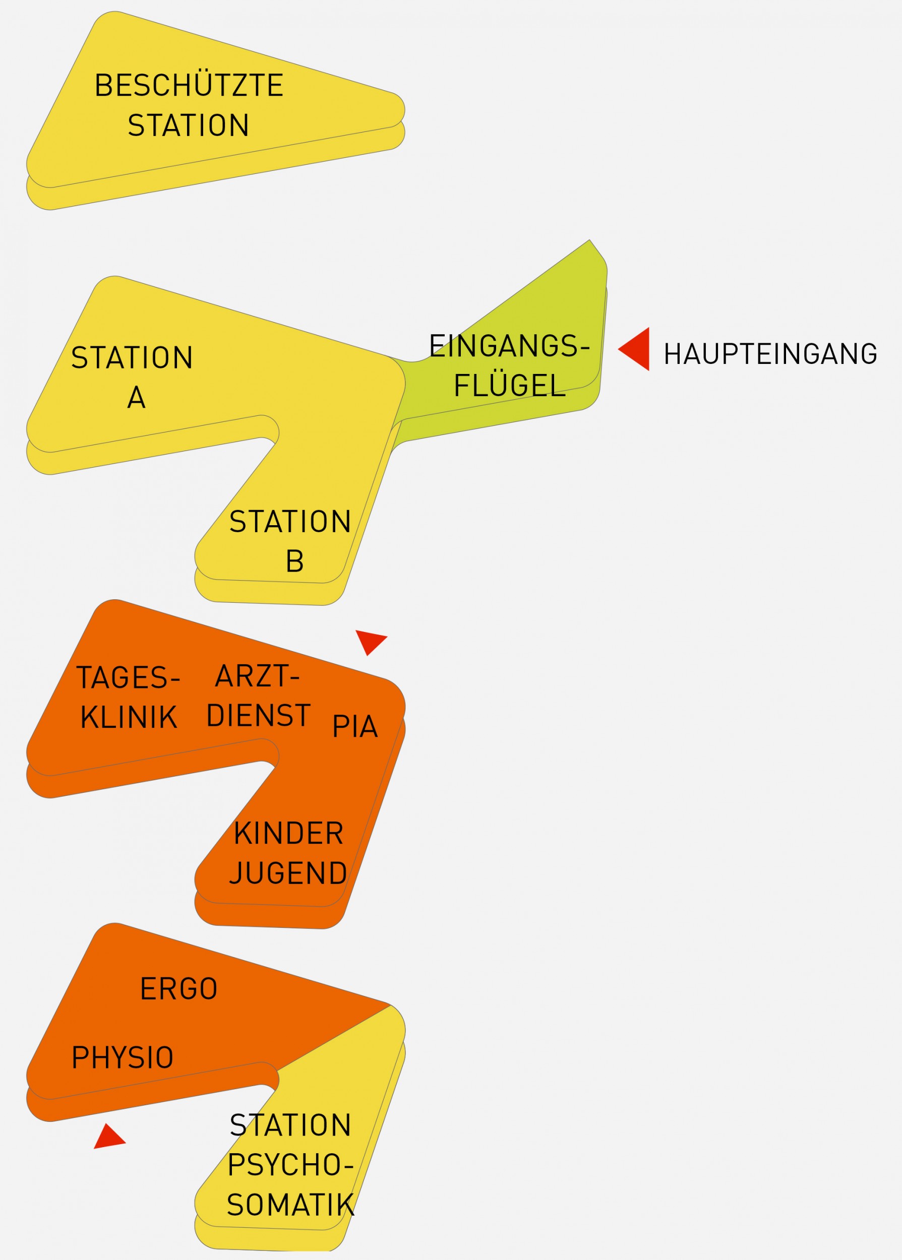 Die Psychiatrie umfasst Pflegestationen, Tagesklinik, beschützte Station mit eigenem Dachgarten sowie einen Bereich für Kinder- und Jugendpsychiatrie. Der Anbau an das Hauptgebäude im Eingangsbereich und im UG erfolgte bei laufendem Krankenhausbetrieb.