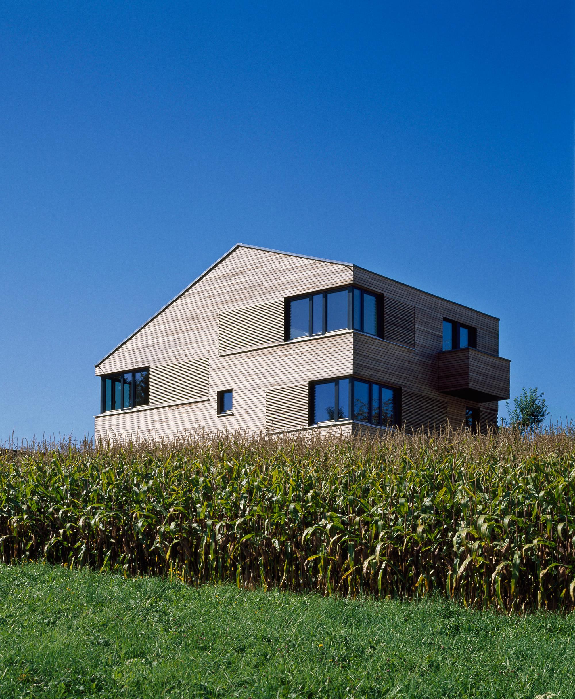 Über Eck angeordnete Fenster ermöglichen aus allen Räumen einen großzügigen Ausblick in die Landschaft. Bis auf die Bodenplatte wurde das Haus komplett in Holzbauweise realisiert und erreicht den KFW-30-Standard.