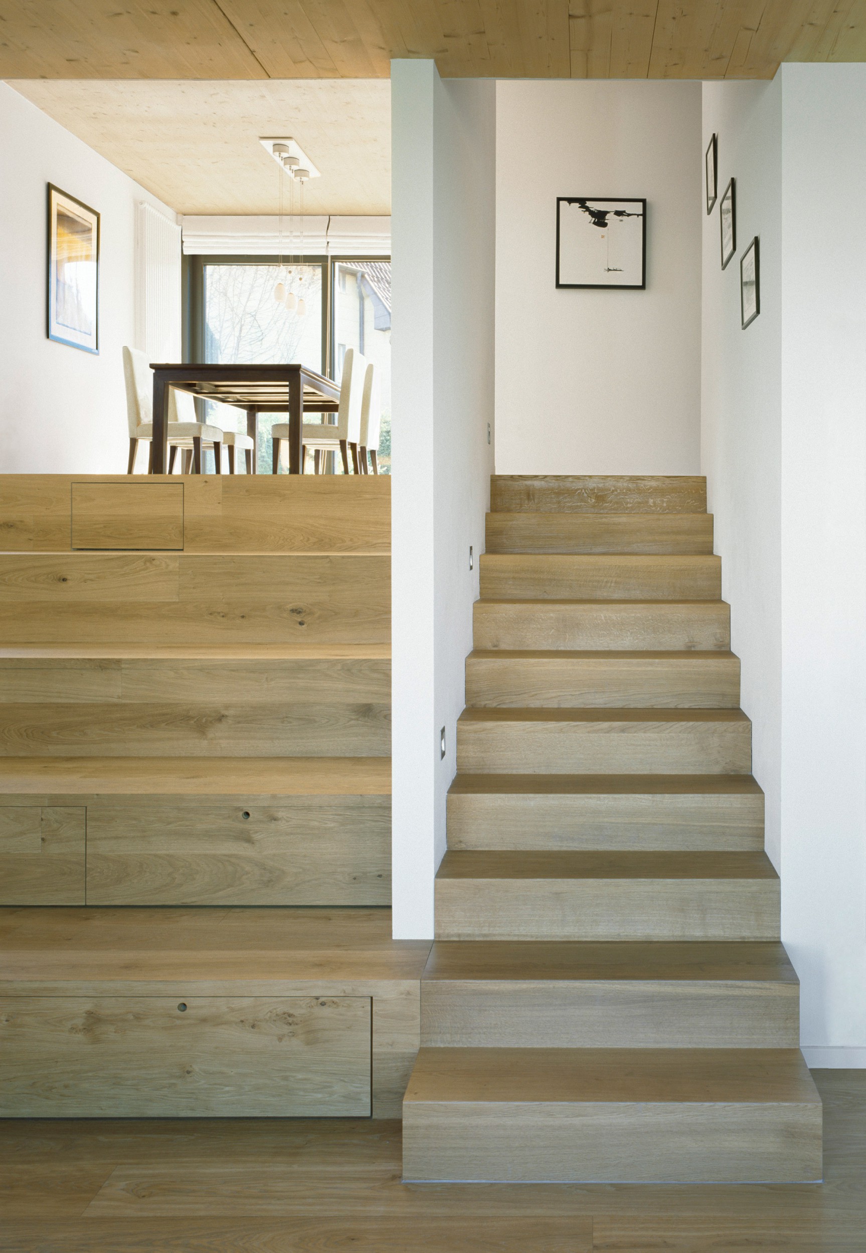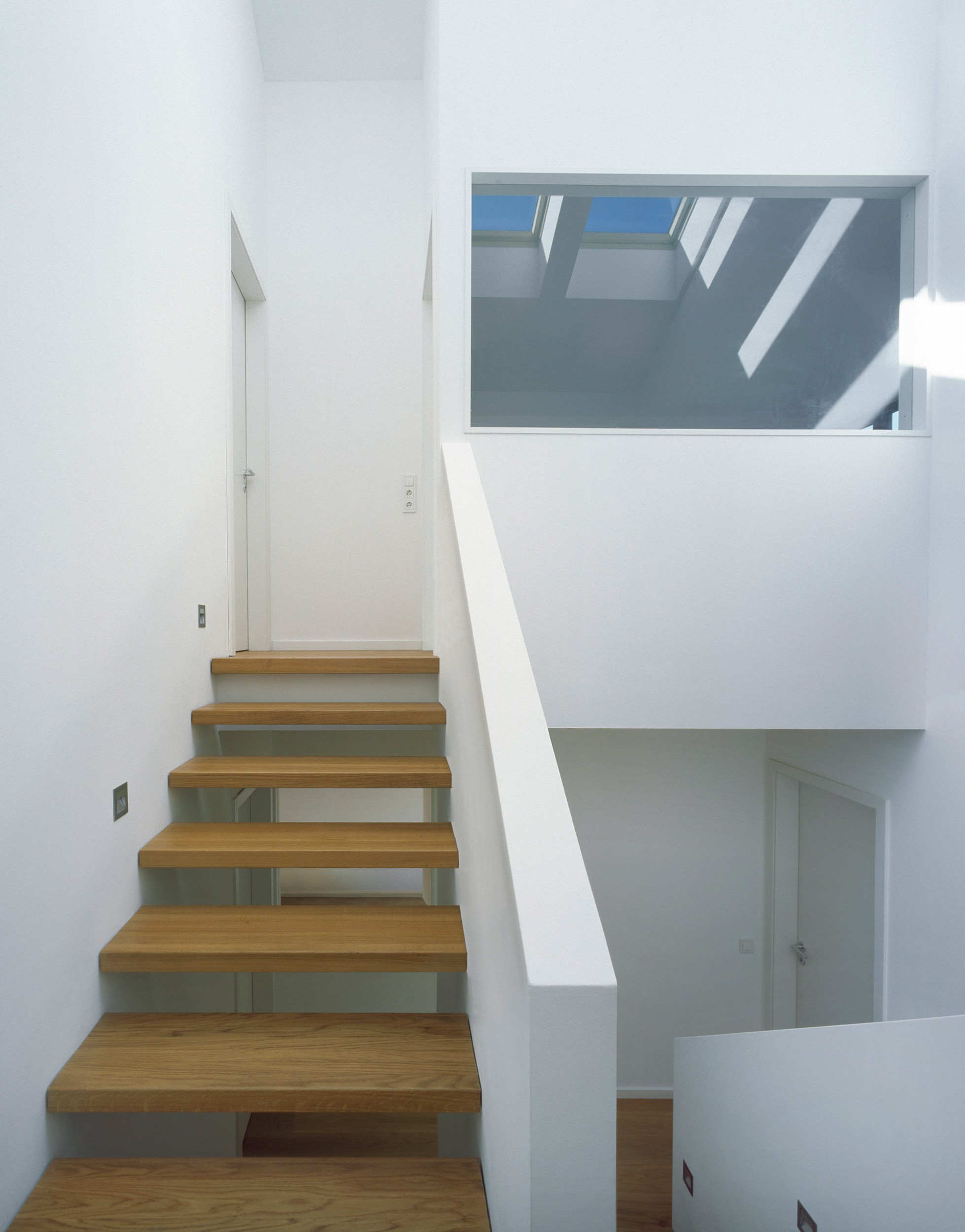 Den Randbedingungen des Grundstücks folgend wurde das Haus als Split-Level-Typ konzipiert. Kompakt organisieren sich die Halbgeschosse mit allen Räumen um einen zentral angeordneten, offenen Treppenraum. Von den galerieartigen Podesten ergeben sich vielschichtige Blickbezüge und Kommunikationsmöglichkeiten.