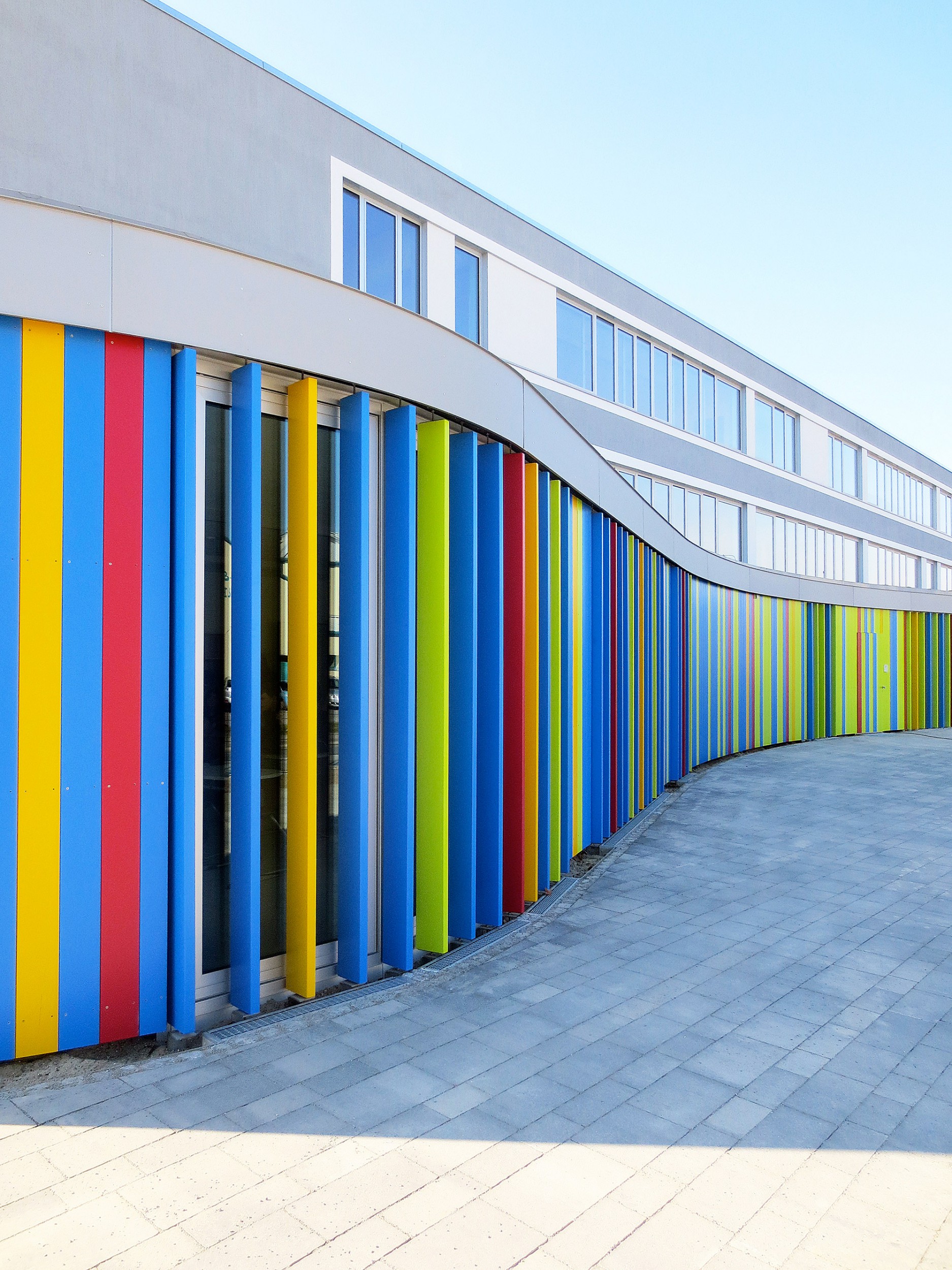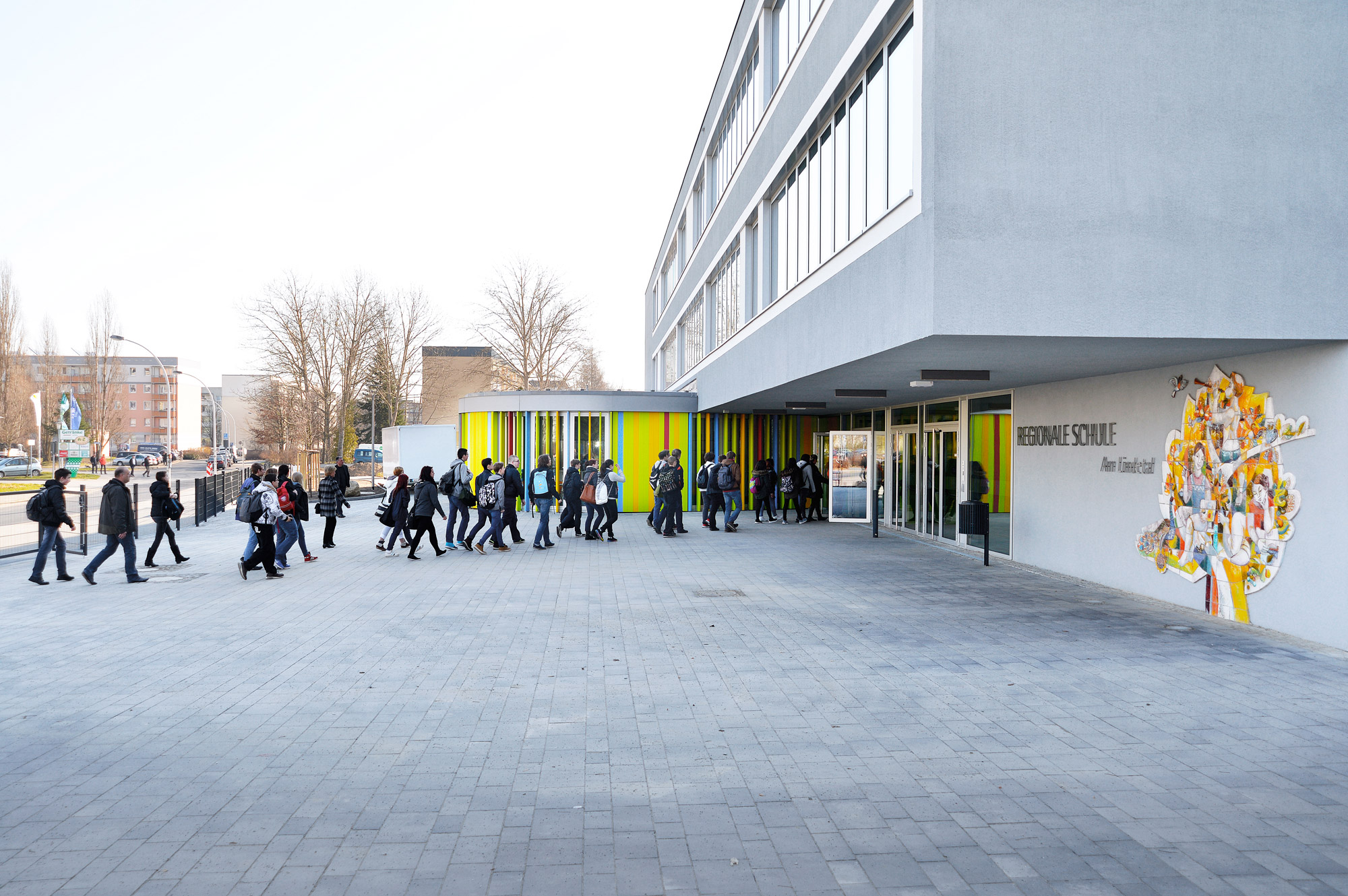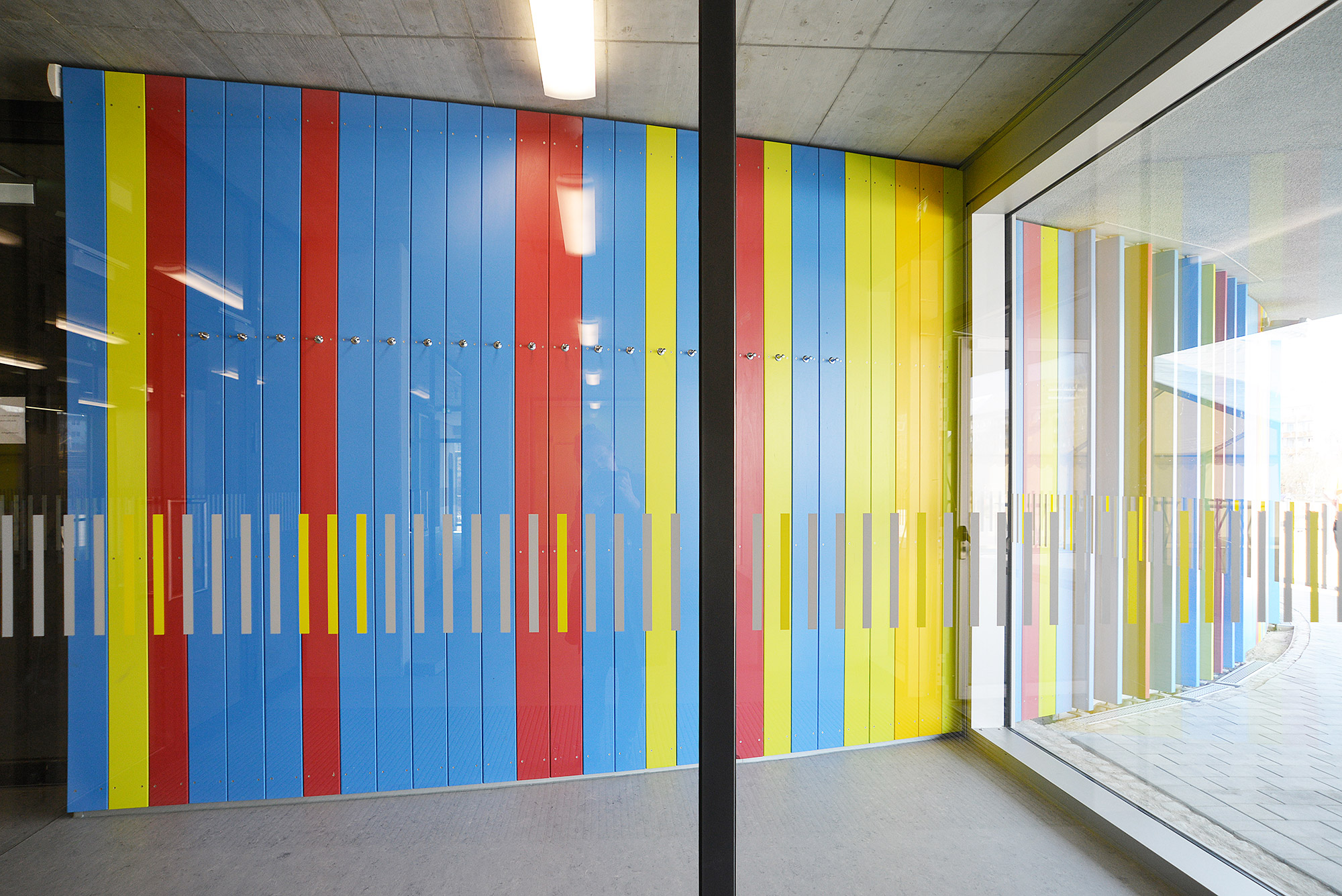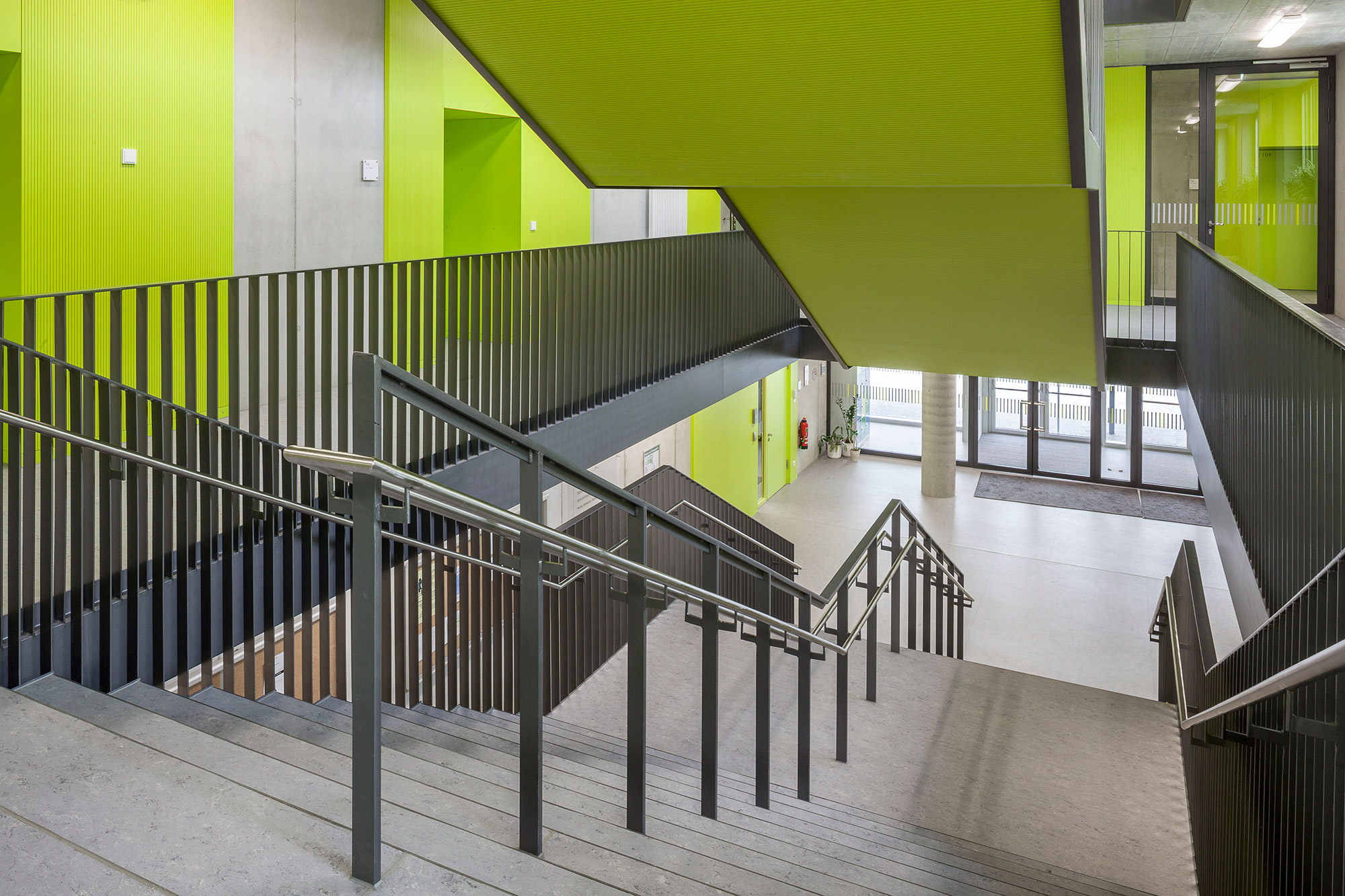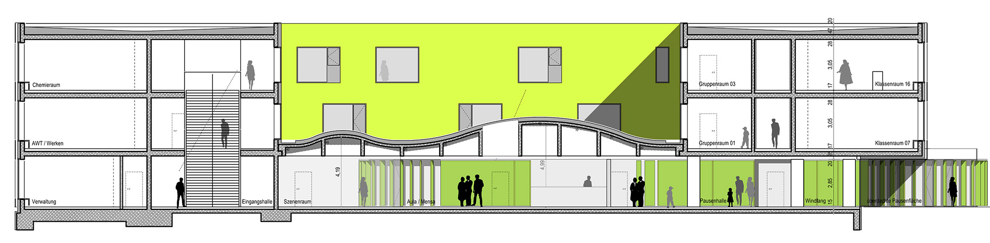 Die dynamische Form des Ganztagsbereichs im Erdgeschoss kontrastiert mit der zurückhaltenden Gebäudegeometrie der Obergeschosse, in denen sich die Unterrichtsräume befinden. Das Erdgeschoss bildet einen klaren Haupteingang zur angrenzenden Straße aus. Von hier aus erreicht man die Treppenhalle, sowie das Herzstück der Schule, den multifunktionalen Speisesaal.