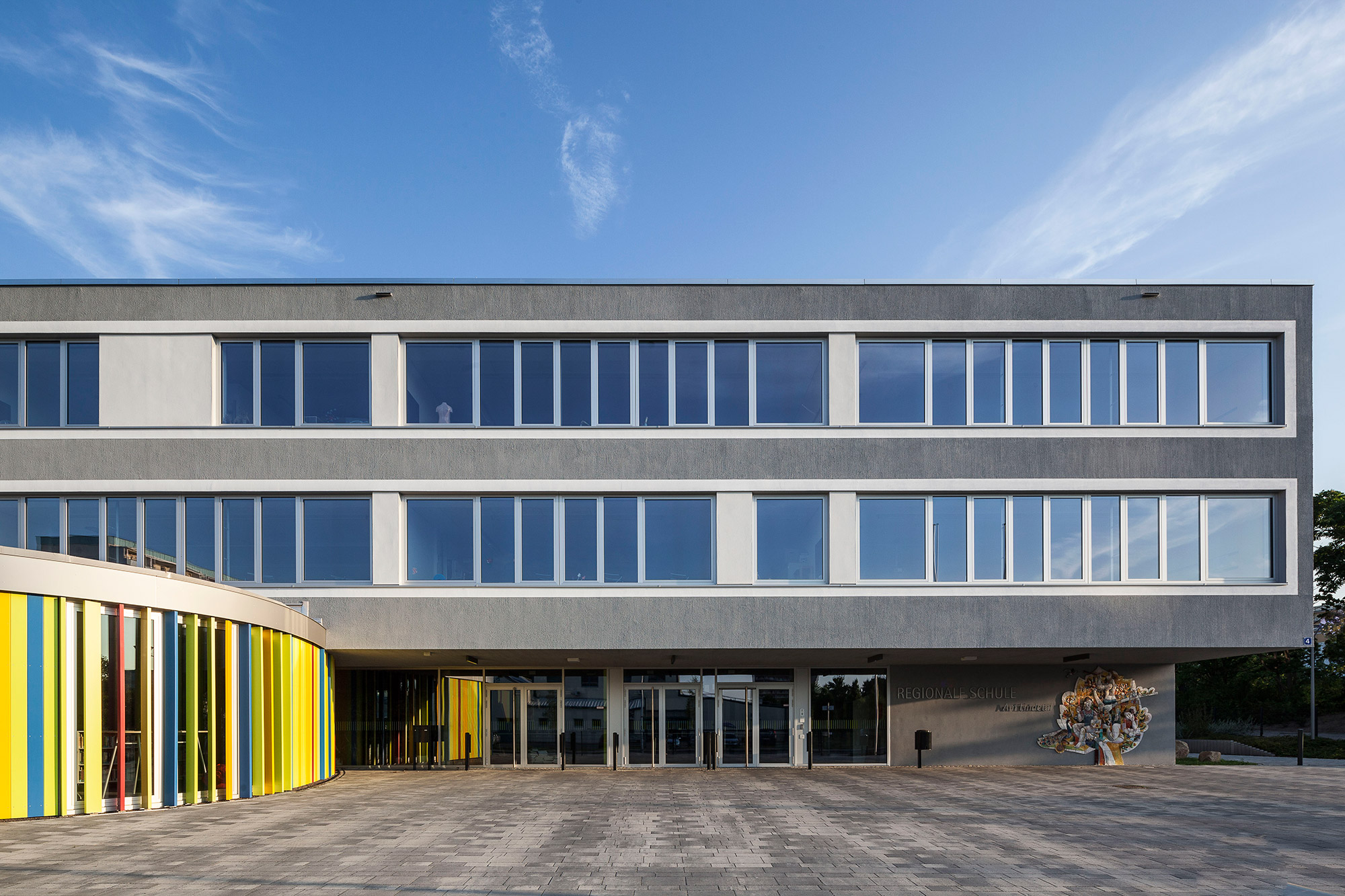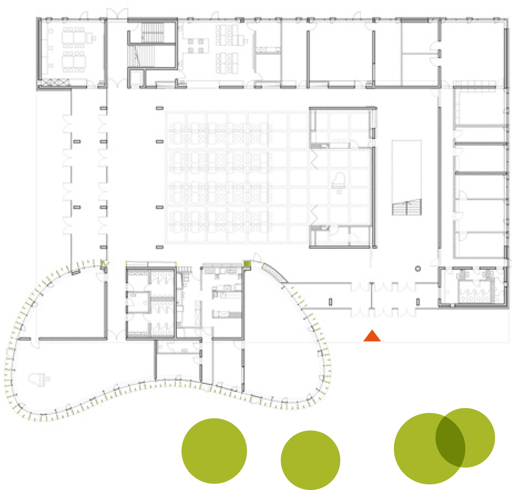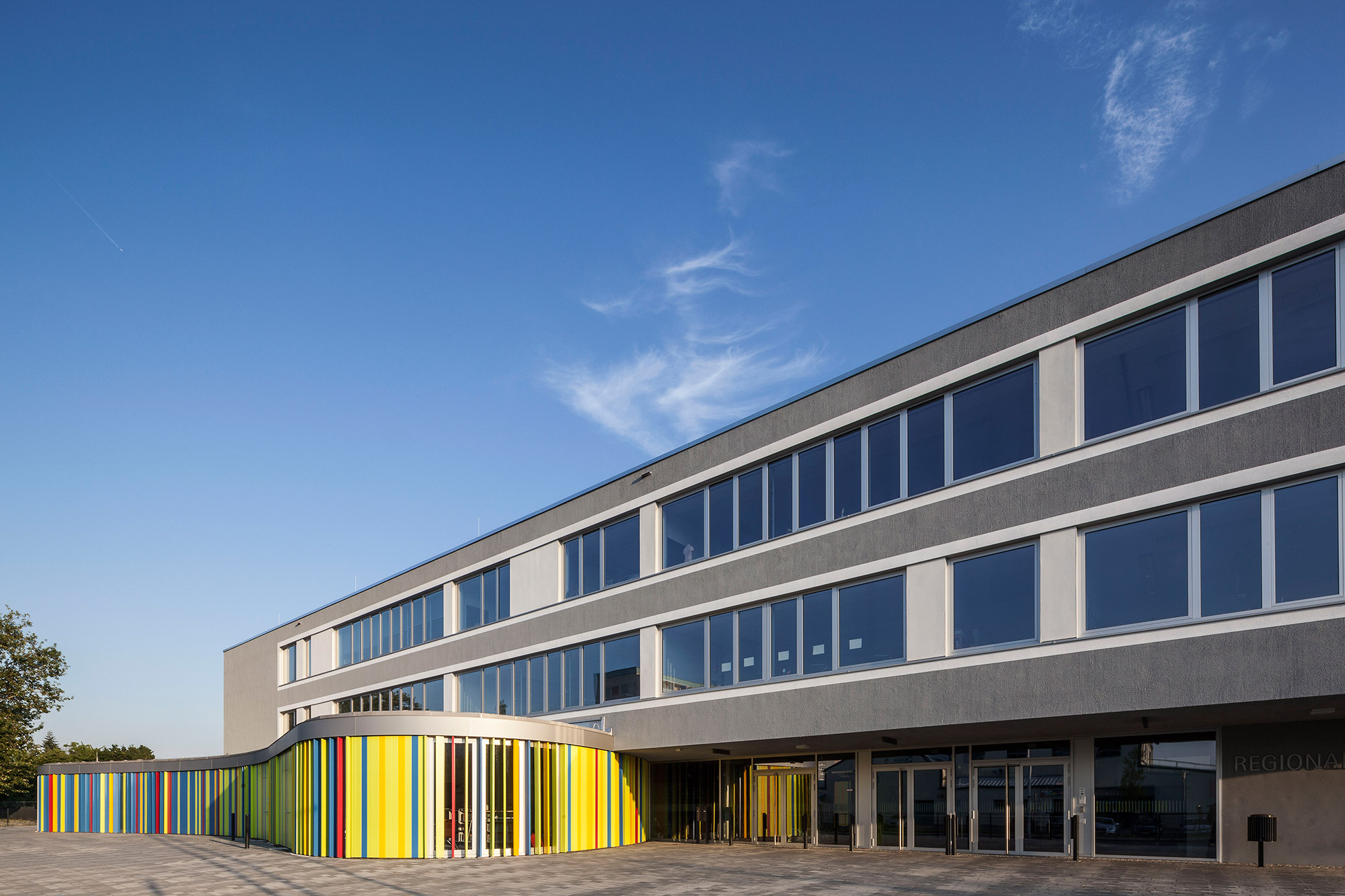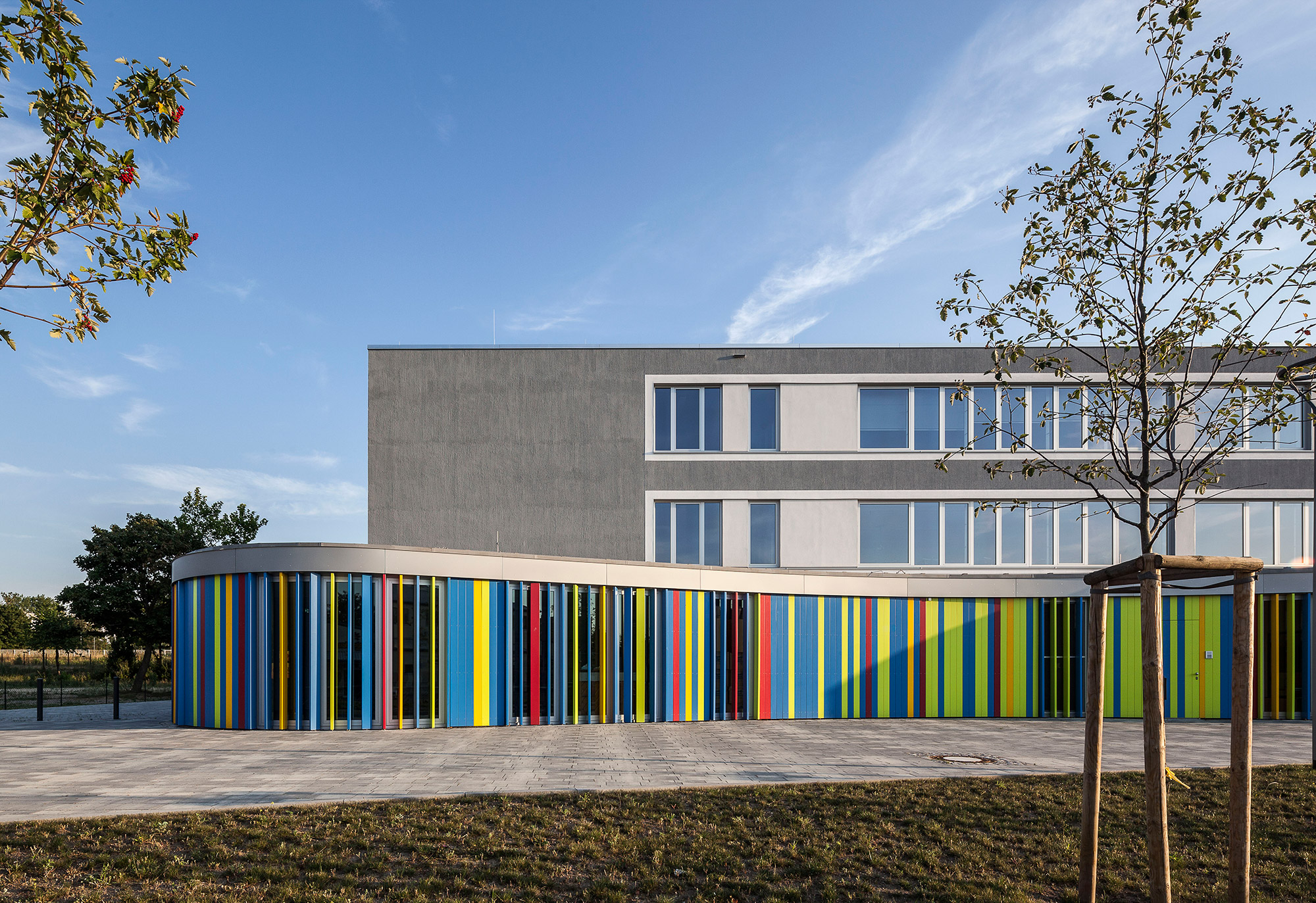 Die dynamische Form des Ganztagsbereichs im Erdgeschoss kontrastiert mit der zurückhaltenden Gebäudegeometrie der Obergeschosse, in denen sich die Unterrichtsräume befinden. Das Erdgeschoss bildet einen klaren Haupteingang zur angrenzenden Straße aus. Von hier aus erreicht man die Treppenhalle, sowie das Herzstück der Schule, den multifunktionalen Speisesaal.