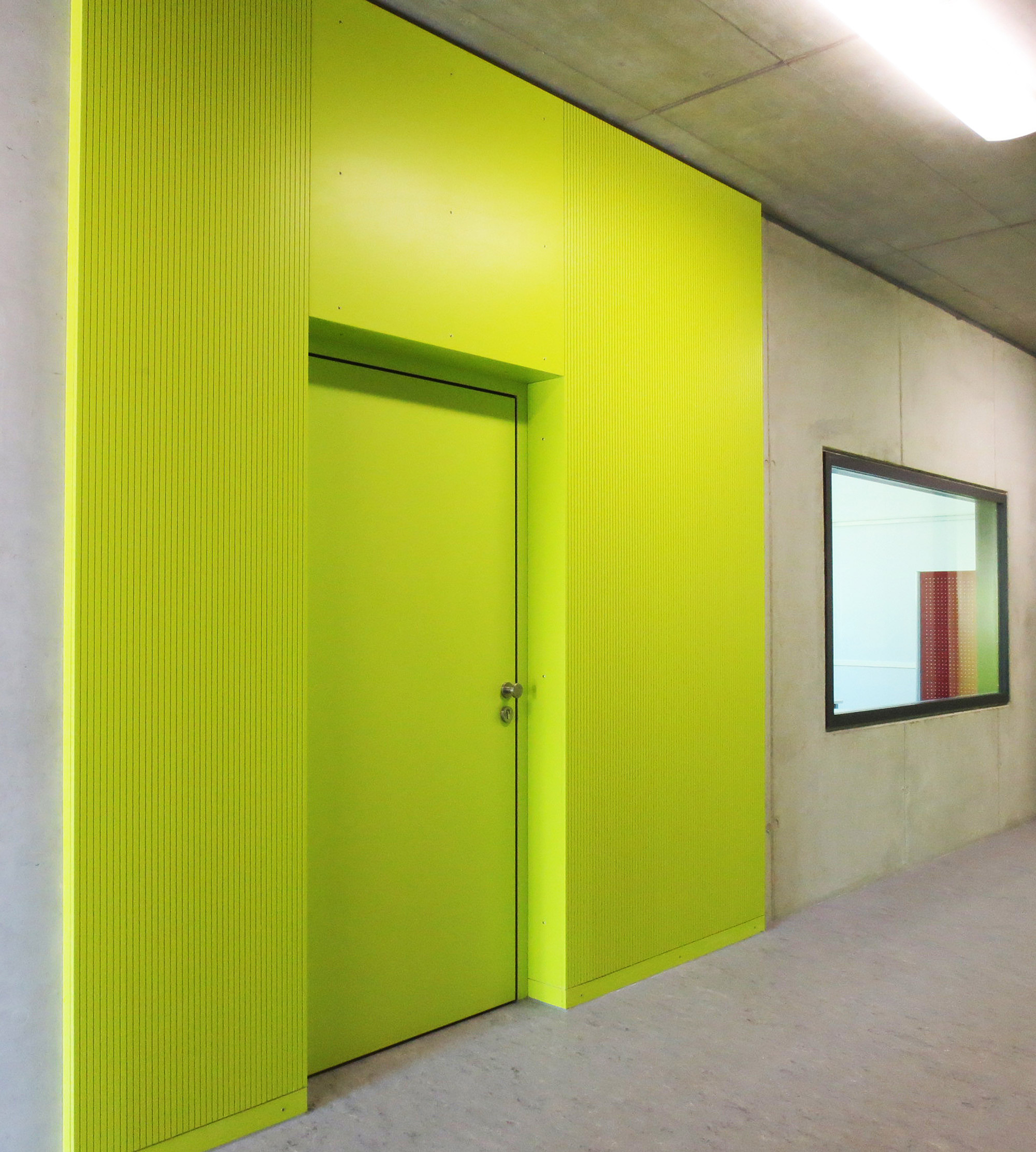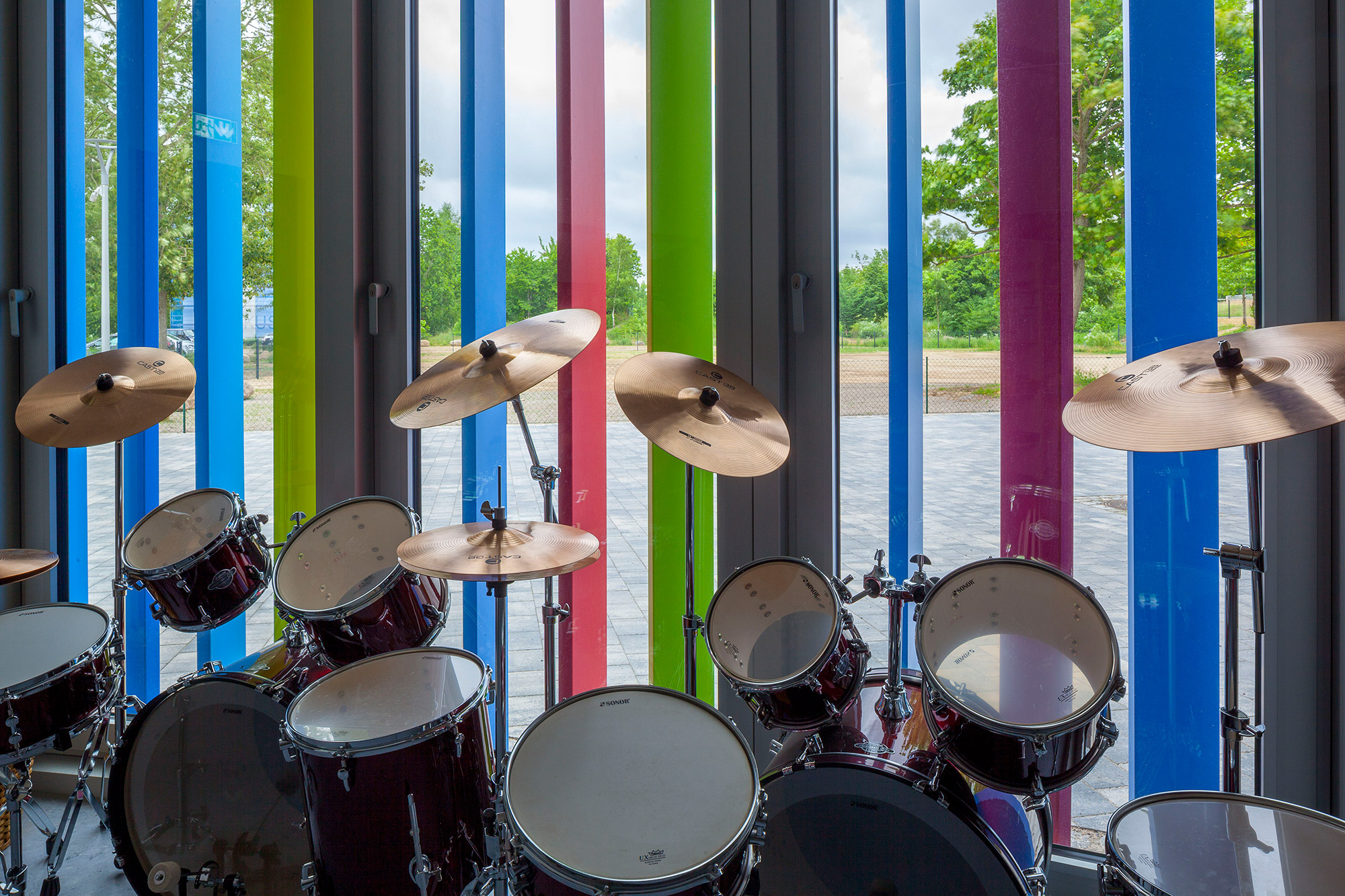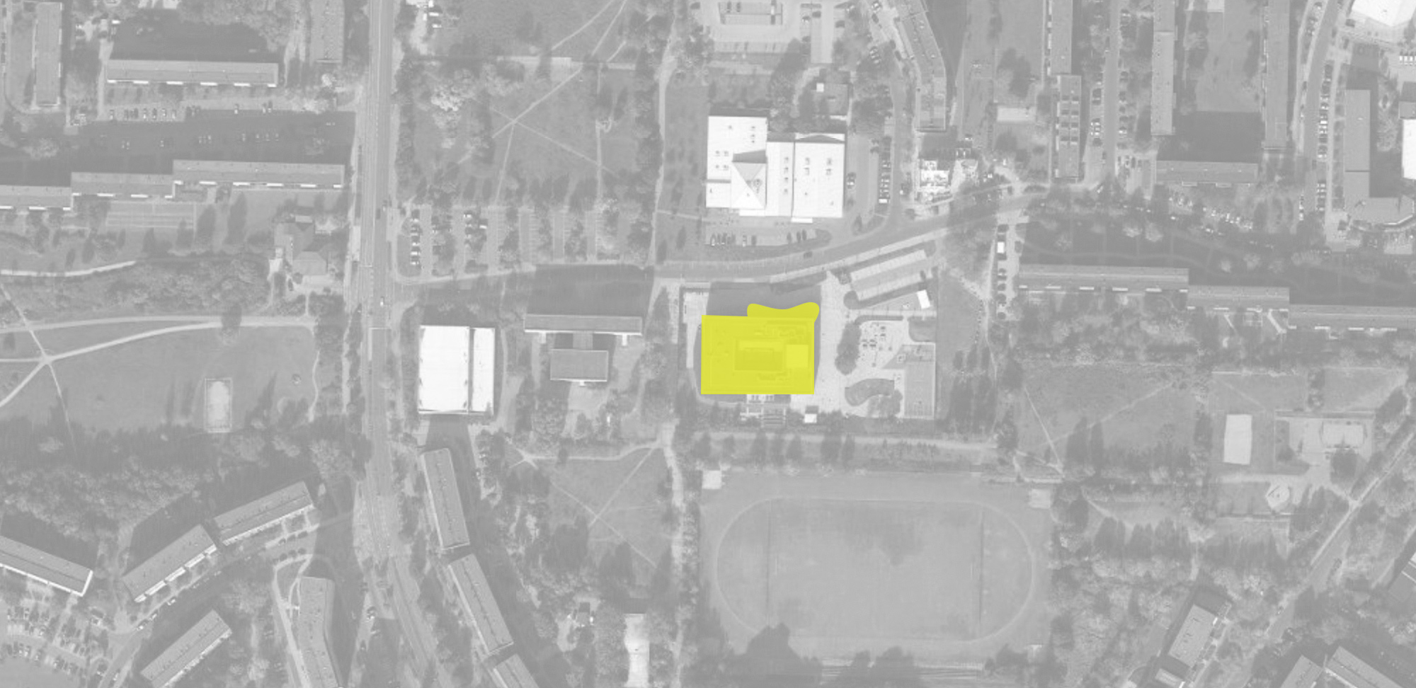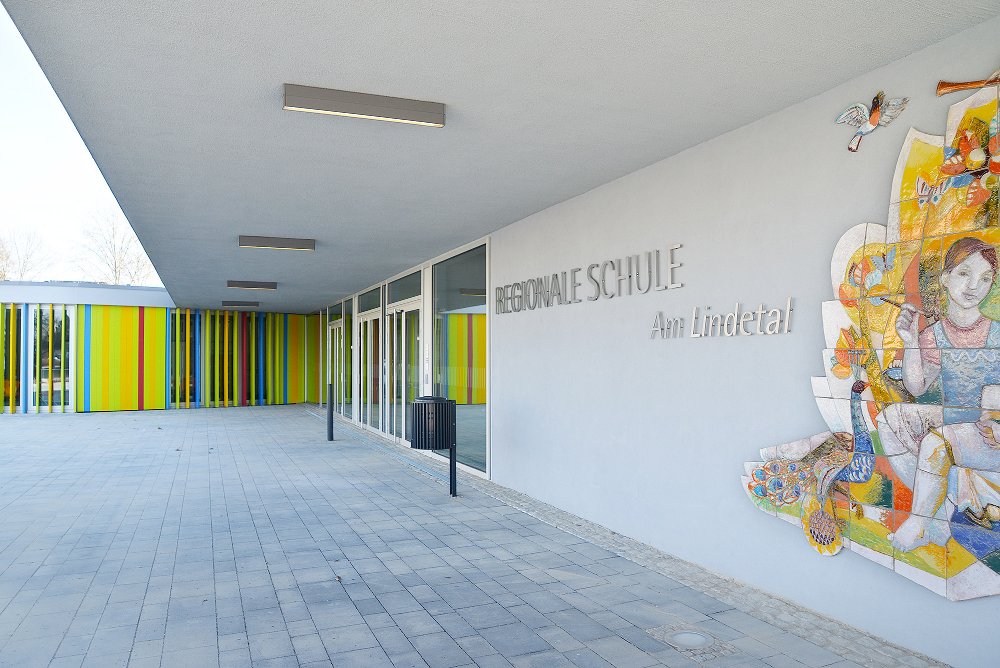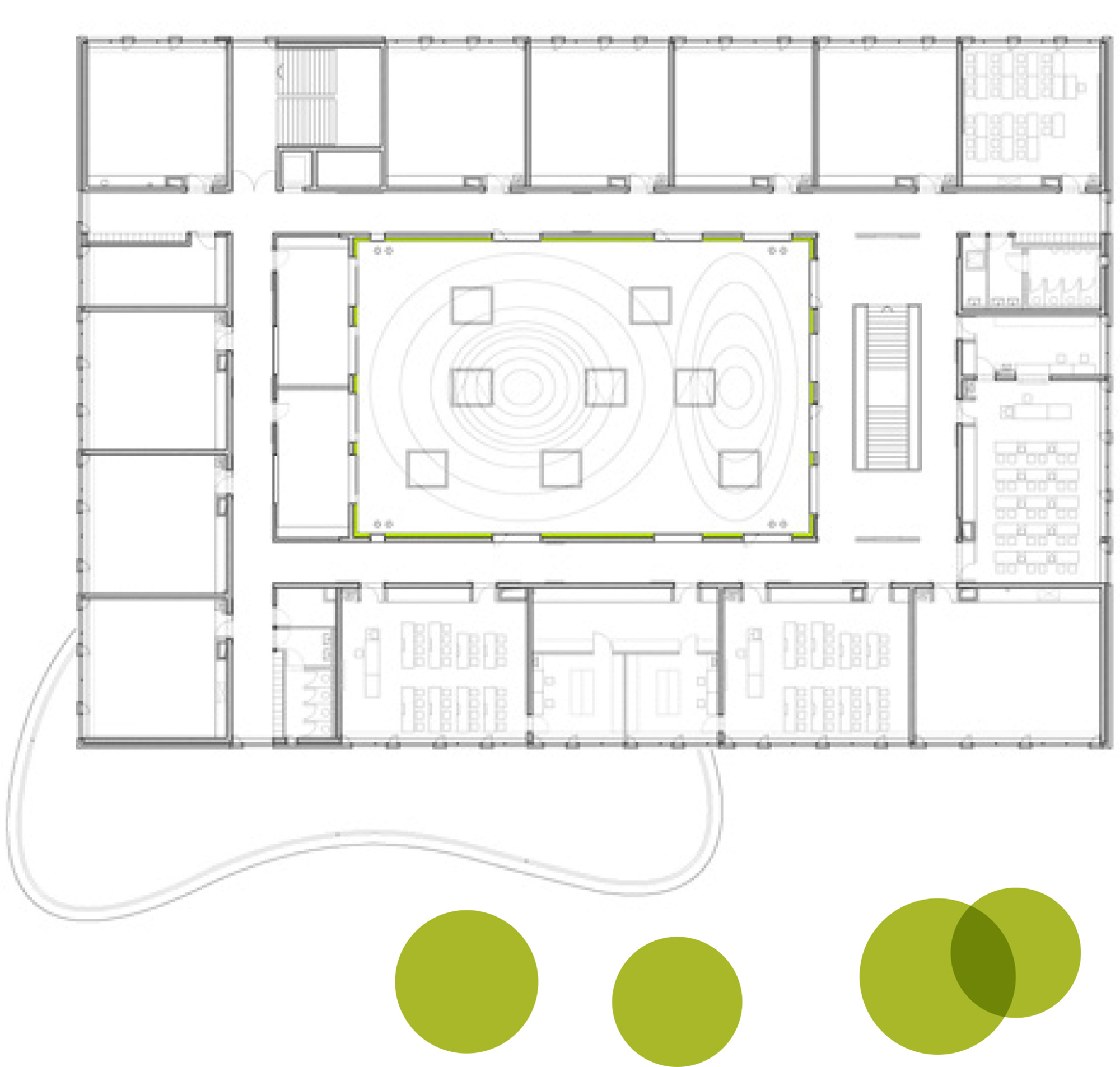 Die dynamische Form des Ganztagsbereichs im Erdgeschoss kontrastiert mit der zurückhaltenden Gebäudegeometrie der Obergeschosse, in denen sich die Unterrichtsräume befinden. Das Erdgeschoss bildet einen klaren Haupteingang zur angrenzenden Straße aus. Von hier aus erreicht man die Treppenhalle, sowie das Herzstück der Schule, den multifunktionalen Speisesaal.
