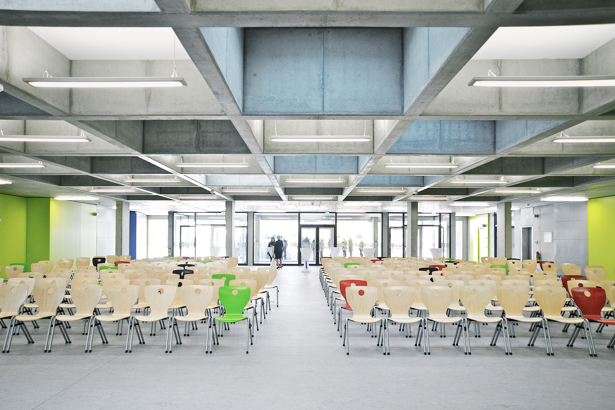 Die Aula wird zum Alleskönner – vom Speisesaal bis zum Konzert. Der dreigeschossige Schulneubau ist als kompakter Baukörper mit einem Innenhof konzipiert. Er umfasst Klassenräume, Fachklassen, Ganztags- und Verwaltungsräume, sowie einen multifunktionalen Speisesaal.