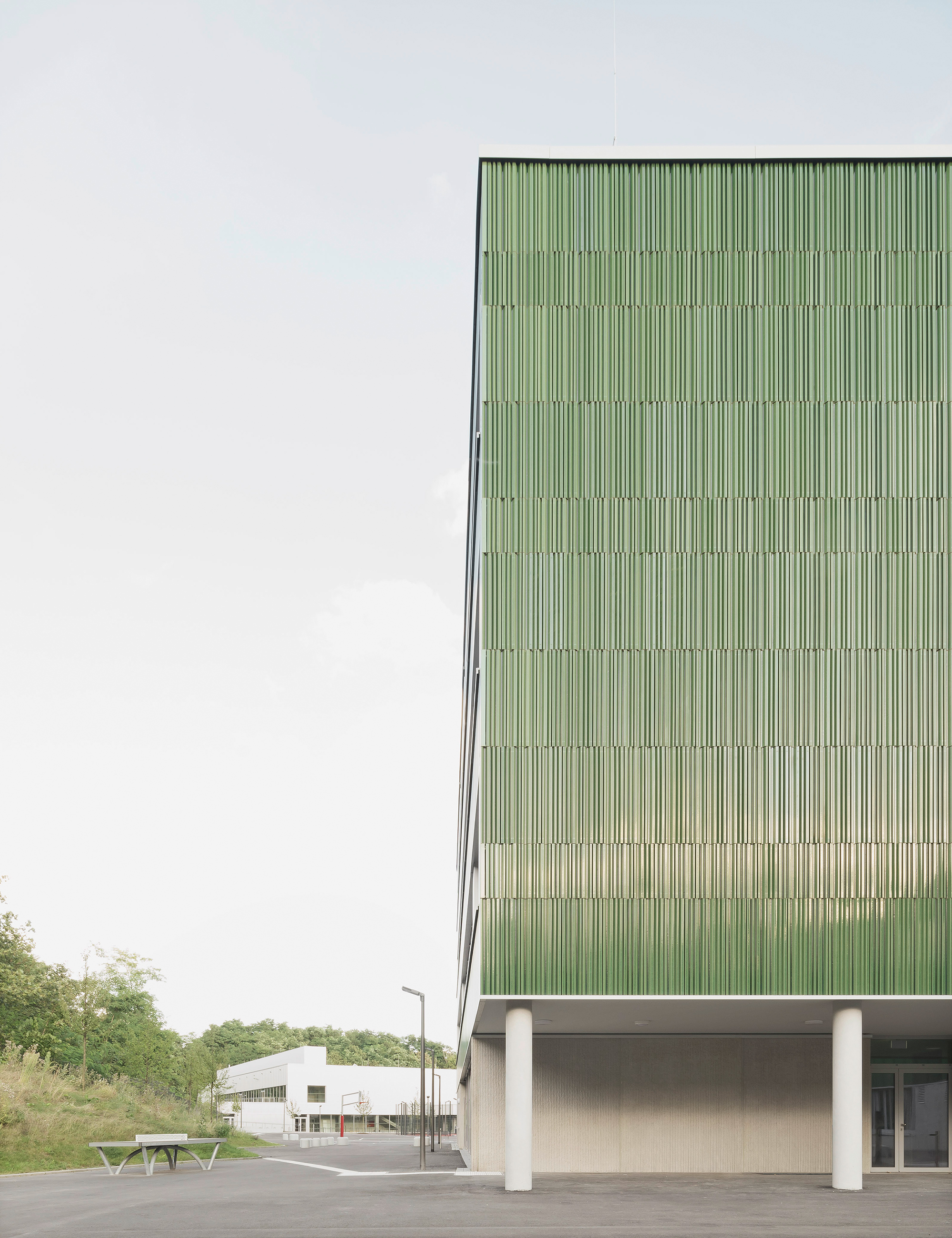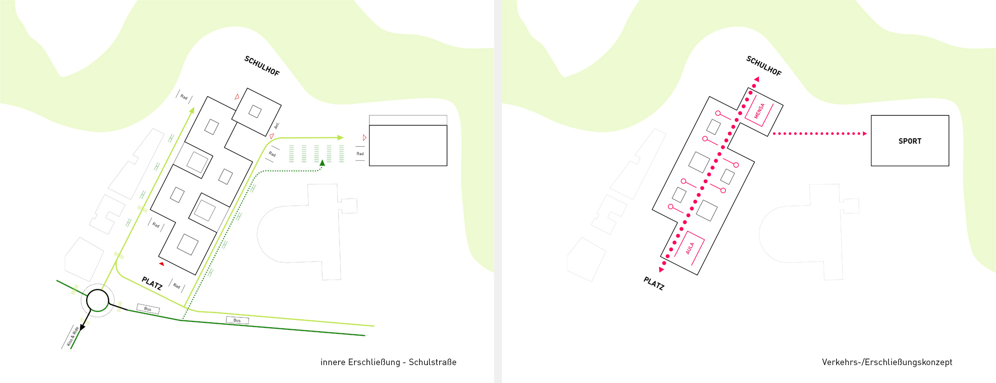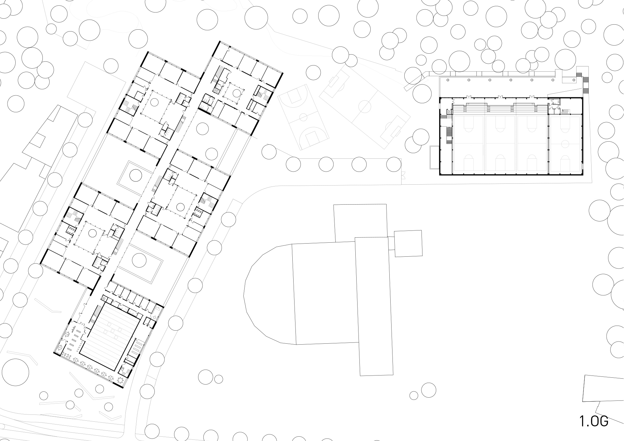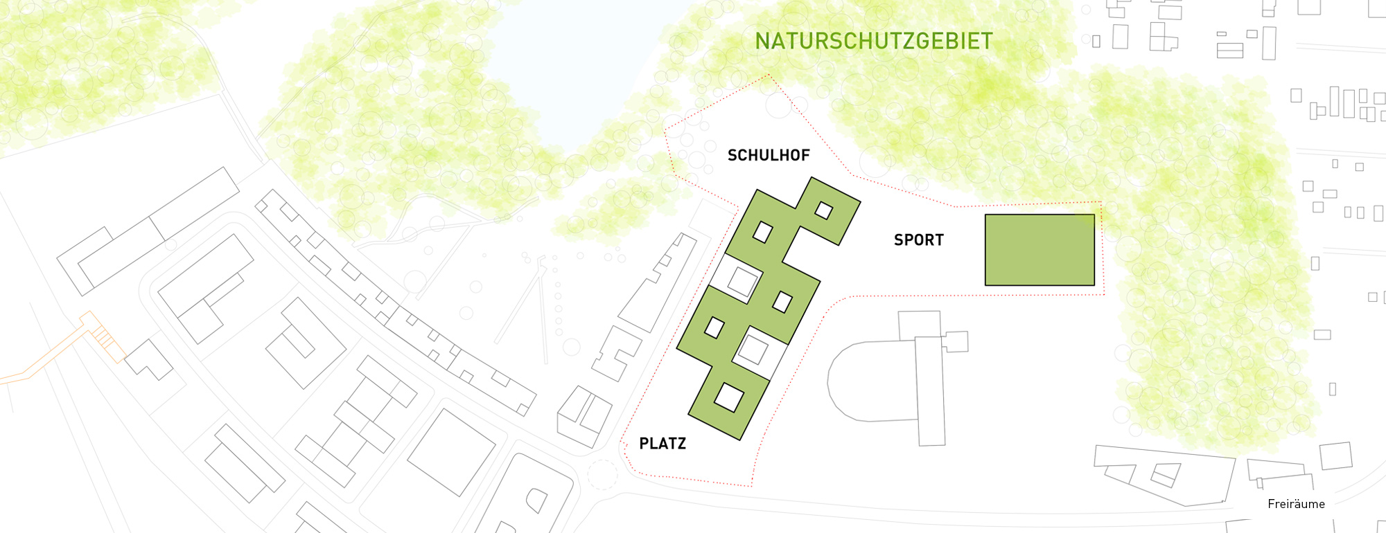 Durch das geordnete Spiel von Masse und Void wird der große Baukörper maßstäblich gegliedert und gleichzeitig das langgestreckte Grundstück optimal besetzt. Im Norden – zum attraktiven Landschaftsraum – entsteht eine großzügige Freifläche, die für Pausen- und Sportaktivitäten genutzt werden kann. Als Link zwischen dem Platz und den Freiflächen fungiert die Schulstraße. Die Dreifeld- und Einfeldsporthalle bilden als kompaktes Volumen im Nordosten den räumlichen Abschluss des neuen Schulstandorts.