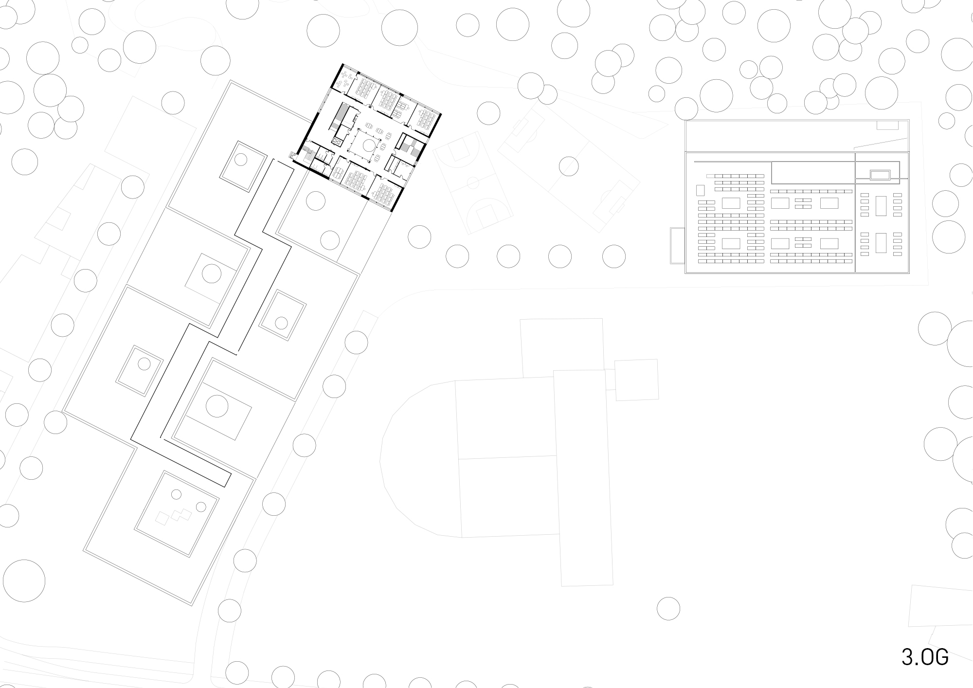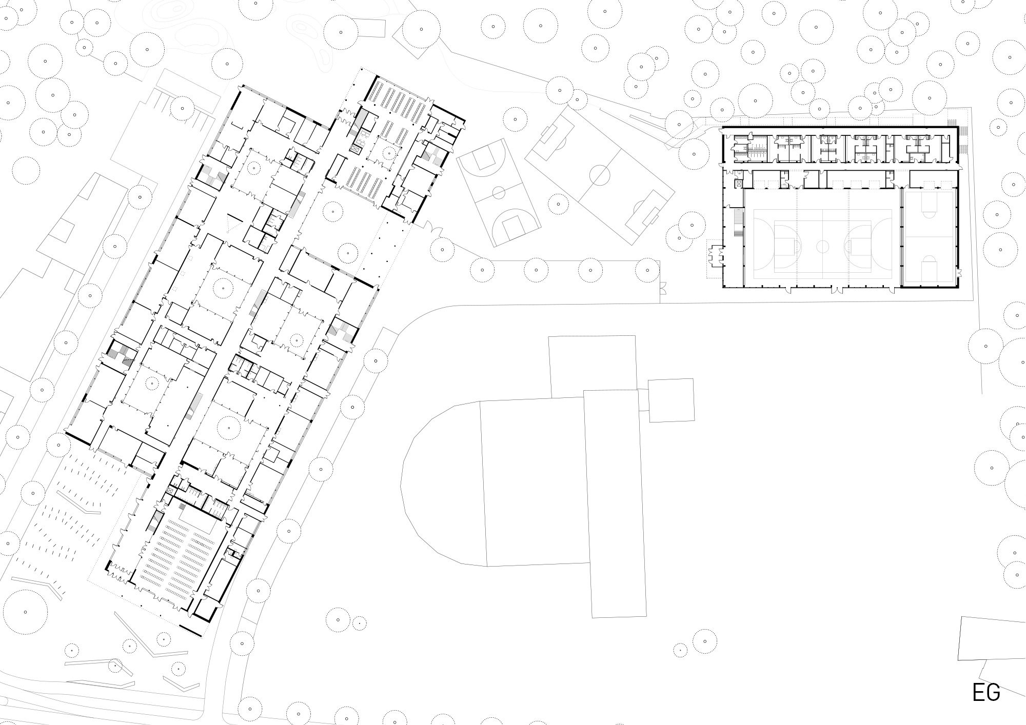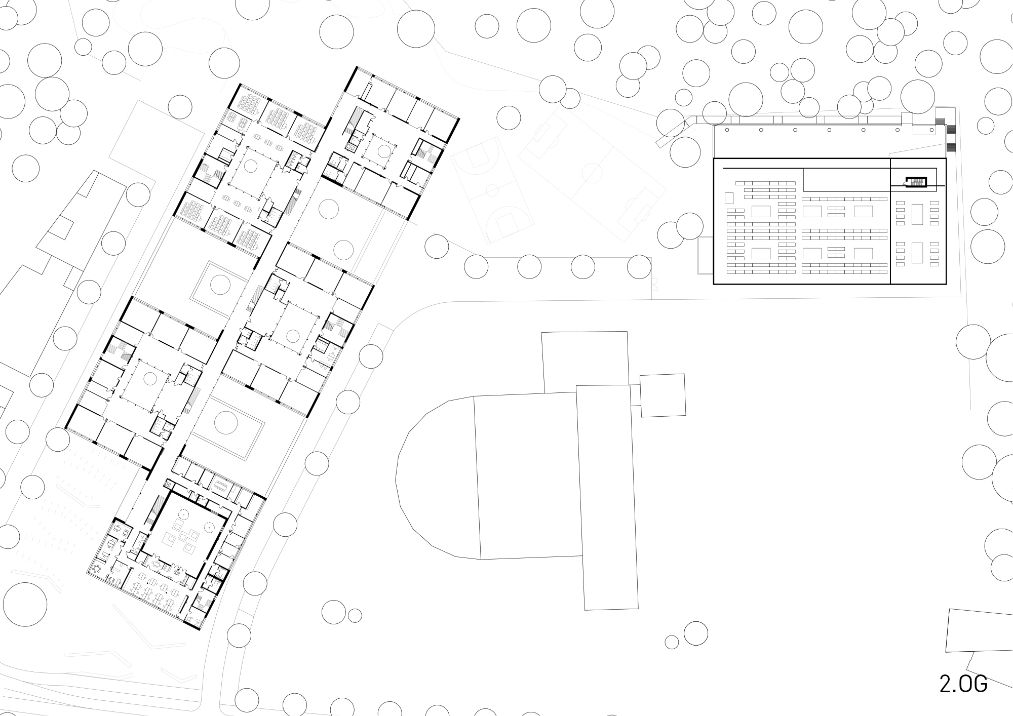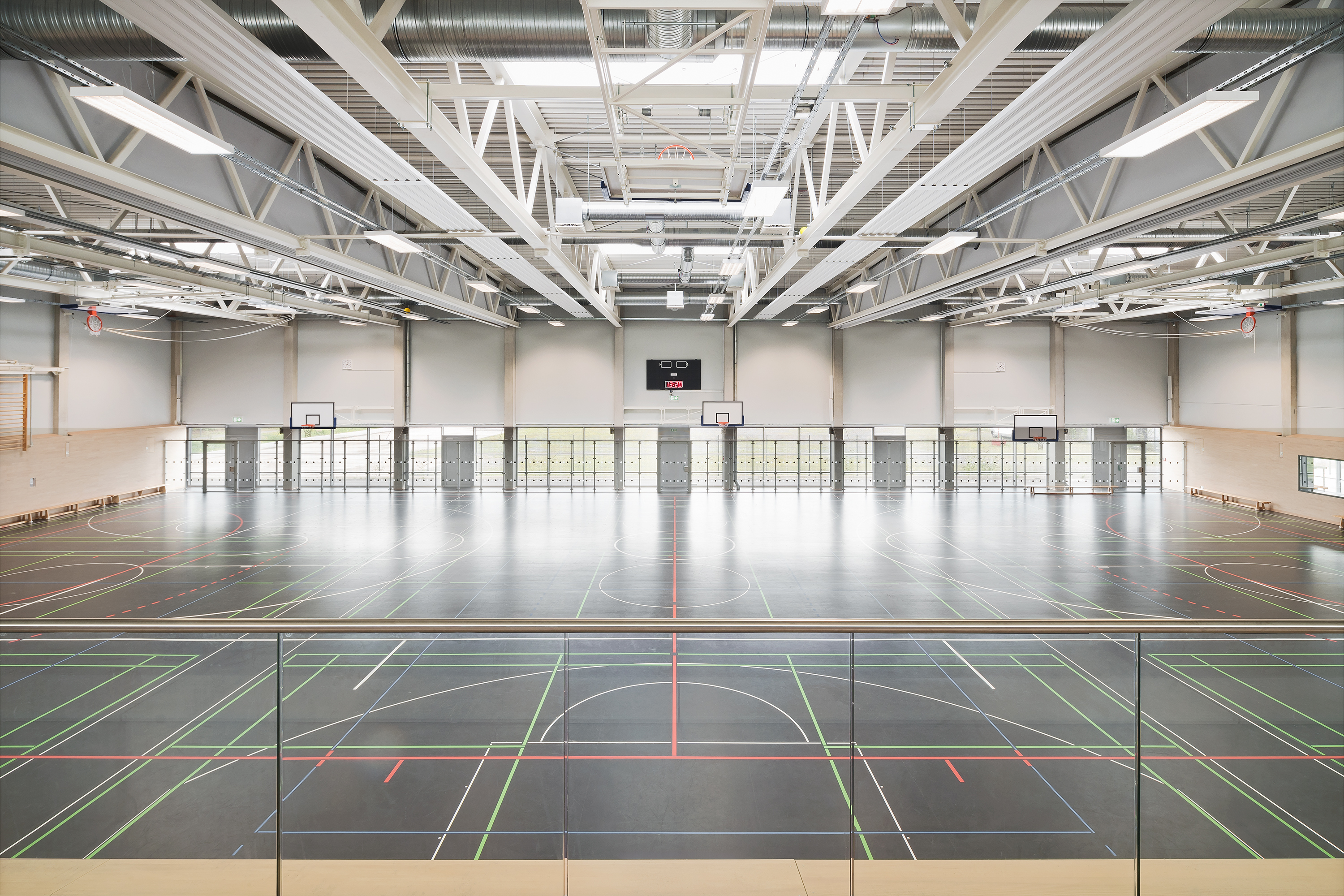 Durch das geordnete Spiel von Masse und Void wird der große Baukörper maßstäblich gegliedert und gleichzeitig das langgestreckte Grundstück optimal besetzt. Im Norden – zum attraktiven Landschaftsraum – entsteht eine großzügige Freifläche, die für Pausen- und Sportaktivitäten genutzt werden kann. Als Link zwischen dem Platz und den Freiflächen fungiert die Schulstraße. Die Dreifeld- und Einfeldsporthalle bilden als kompaktes Volumen im Nordosten den räumlichen Abschluss des neuen Schulstandorts.