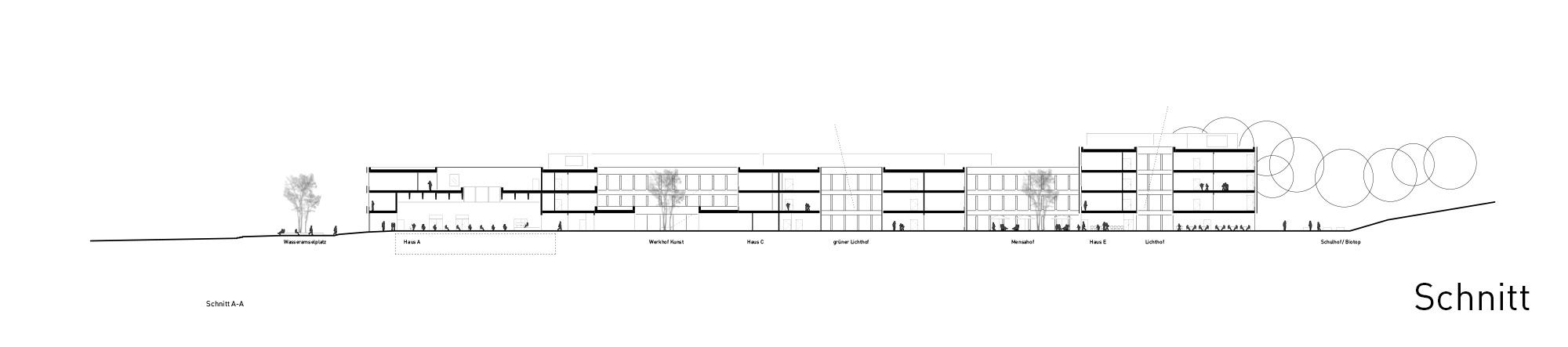 Der Entwurf setzt konsequent das vorgegebene pädagogisch-räumliche Konzept um. Als Leitbild dient dabei die Schule als lebendiger Organismus, als 'kleine Stadt in der Stadt'. Funktionale Clustereinheiten, ausgestaltet als 3-4 geschossige ablesbare Volumen/Häuser gliedern sich, alternierend mit Innenhöfen, entlang einer linearen 'Schulstraße' an.
