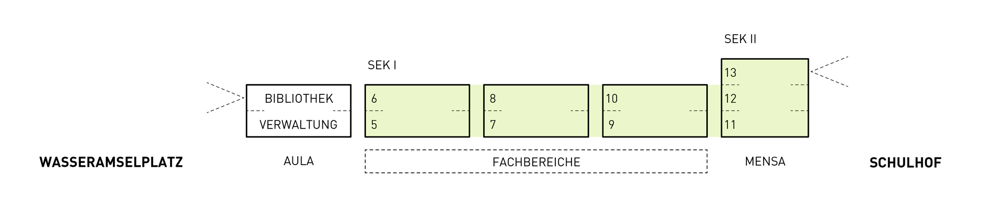 Die Schule wird, als Auftakt und zur Adressbildung der entstehenden Bildungslandschaft, an einem neuen Platz – dem Wasseramselplatz – situiert. Der Platz fungiert als Bindeglied zwischen den Gebäuden der Bildungslandschaft (Schulen + Kita) und verknüpft das Triotop im Westen und das Gewerbegebiet im Süden und Osten. Darüber hinaus bietet er einen angemessenen Freiraum, um die neuen Bewegungsströme der Schule aufzunehmen.